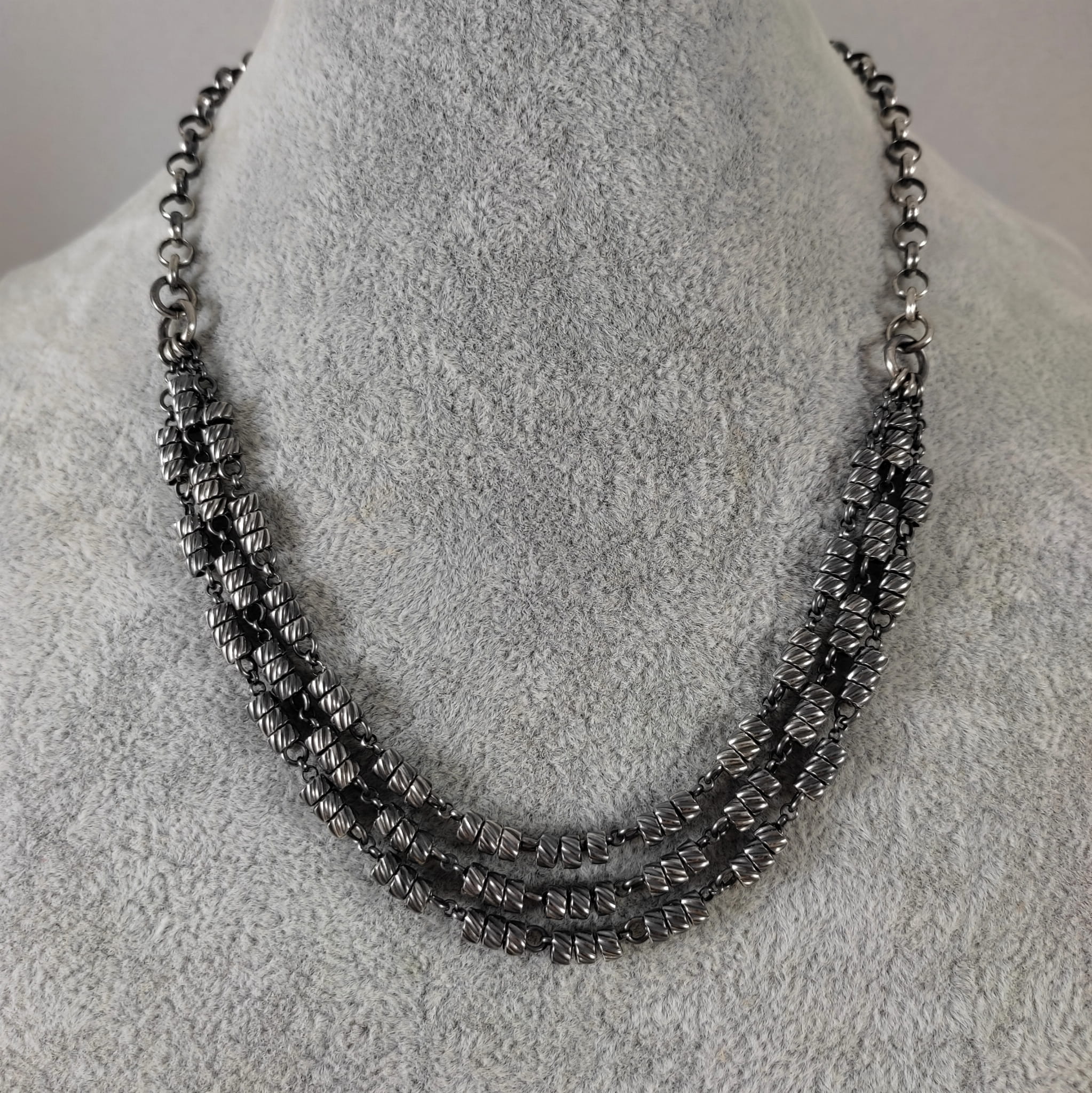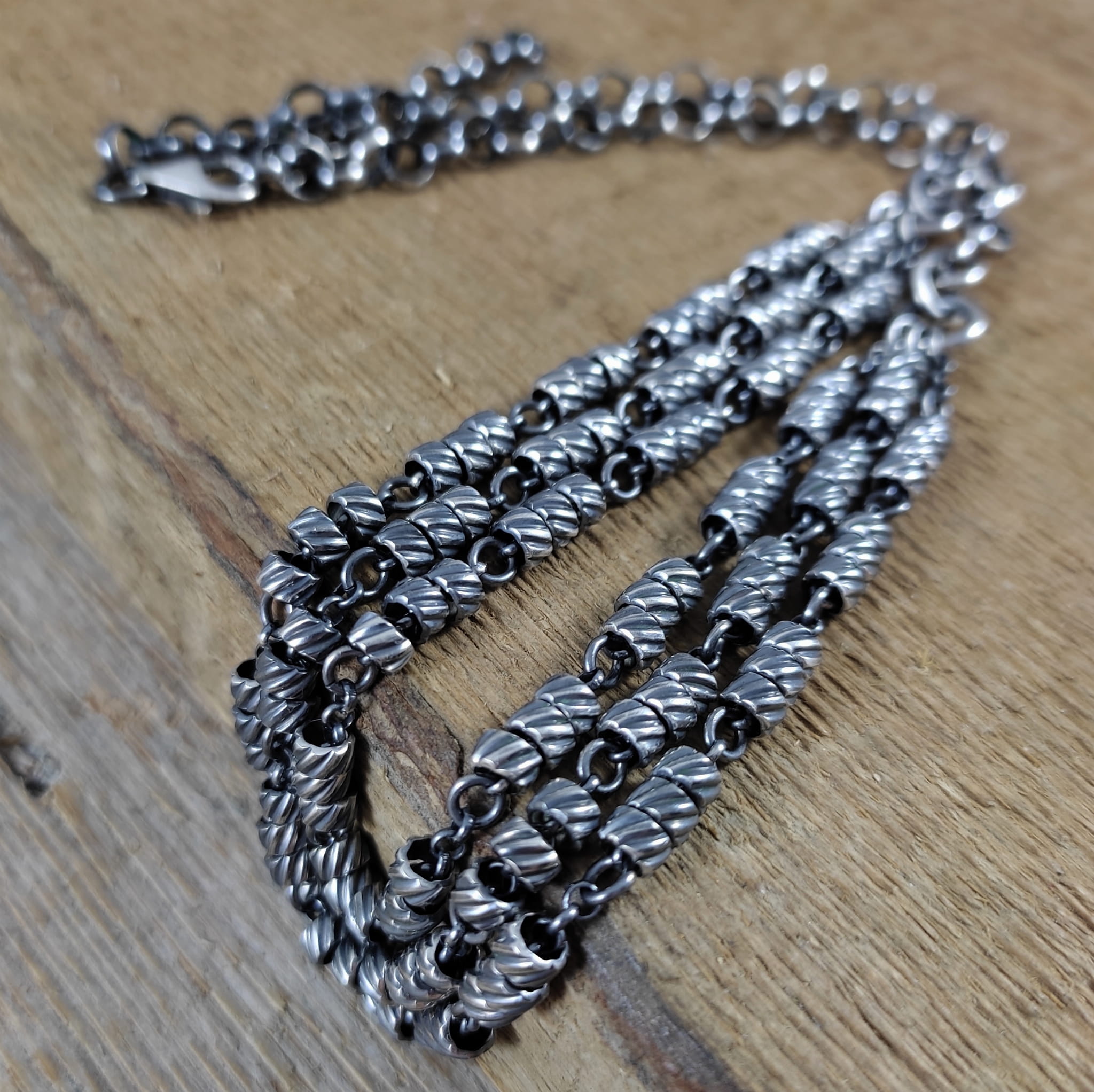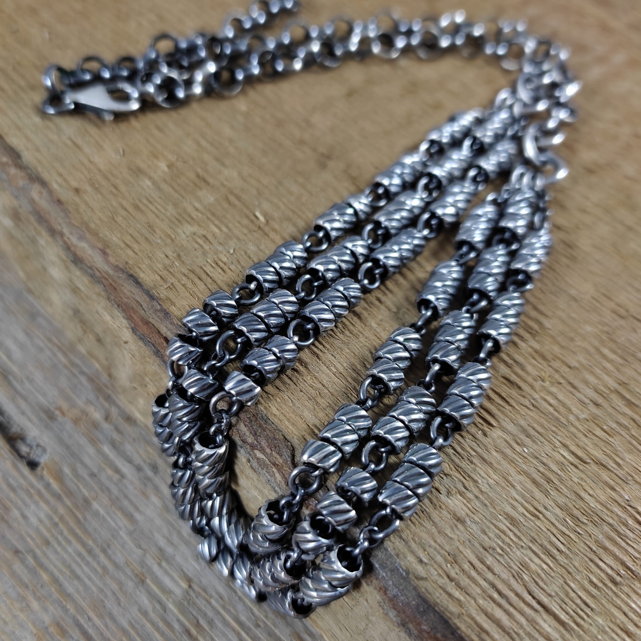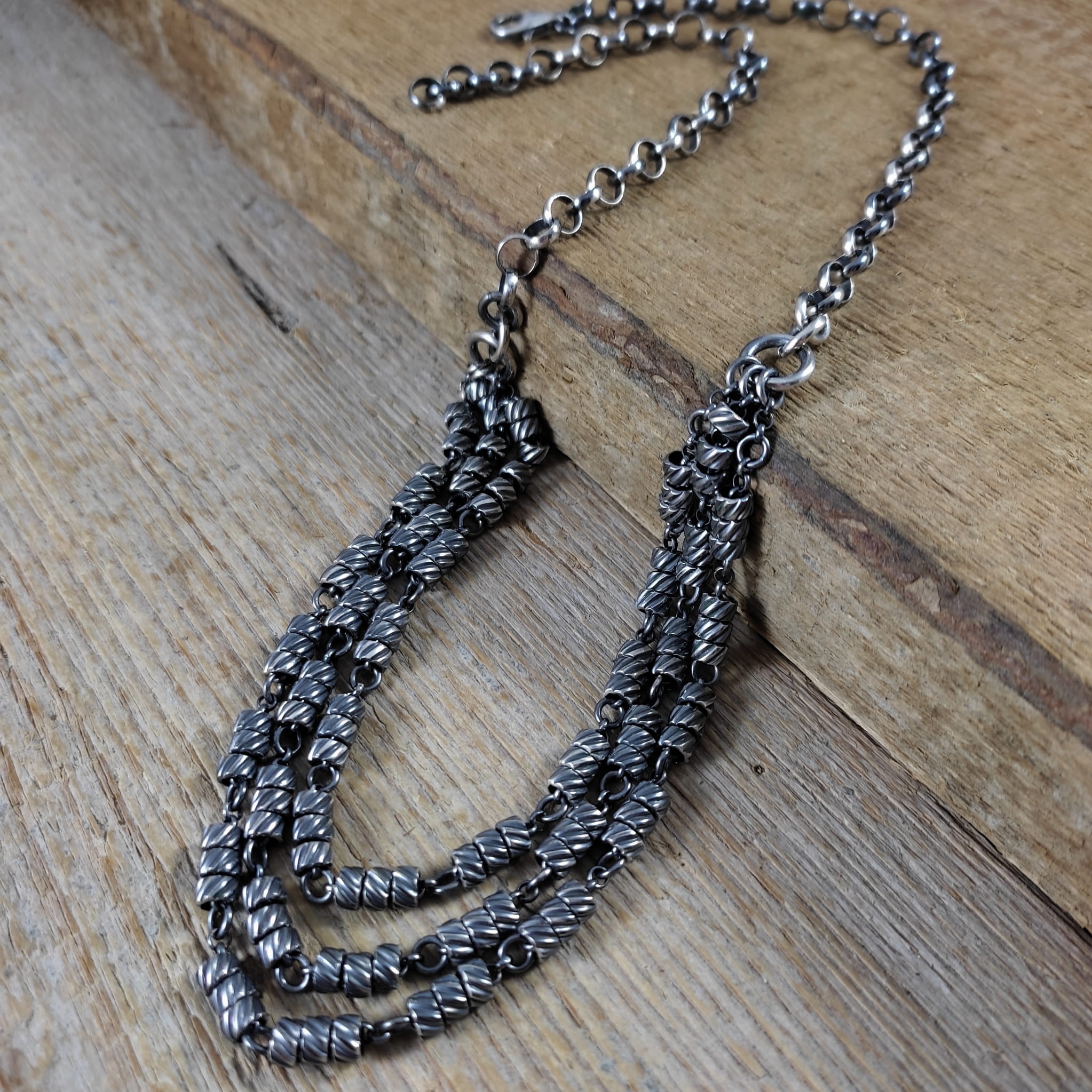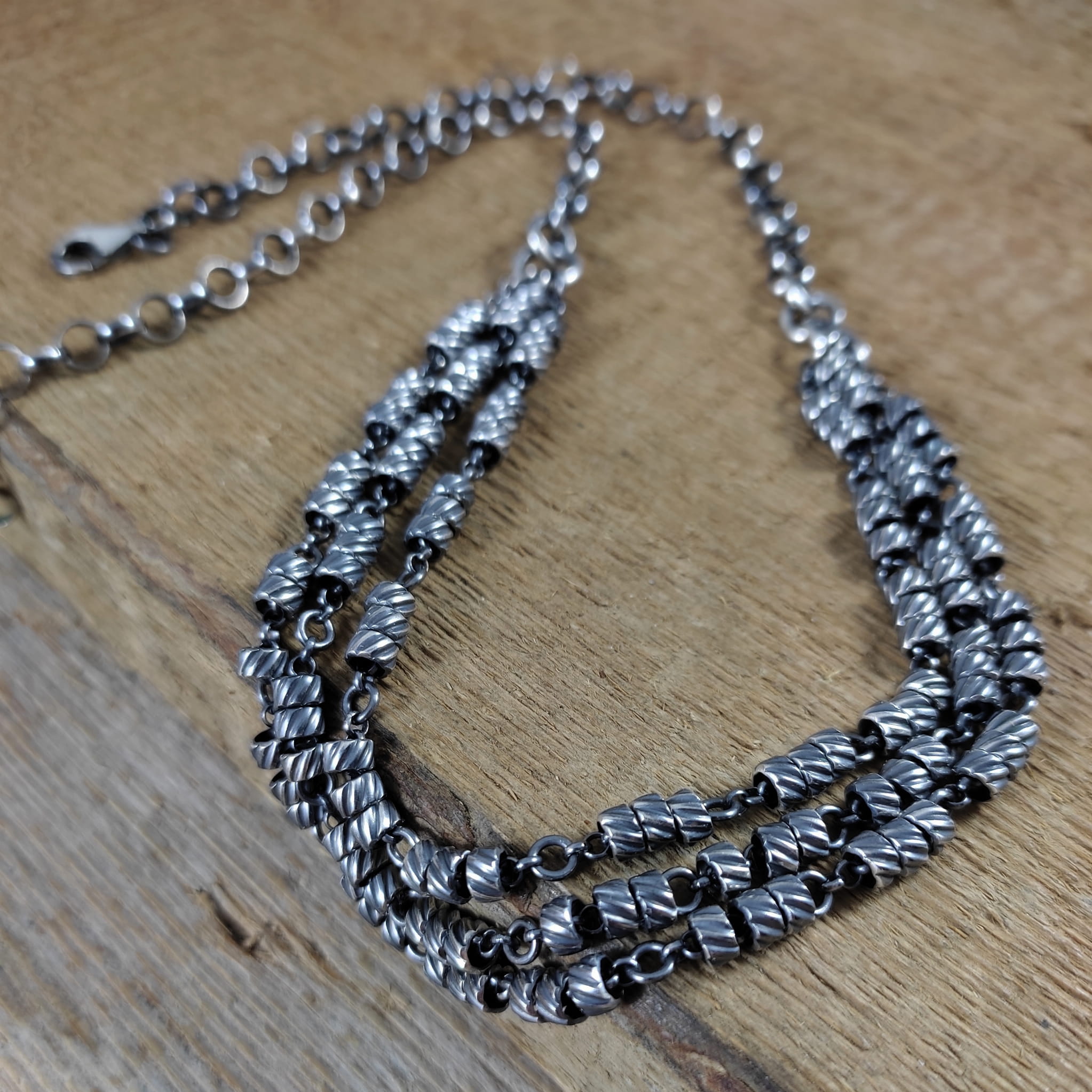 Naszyjnik wykonany ze srebra 925, oksydowanego i wypolerowanego.