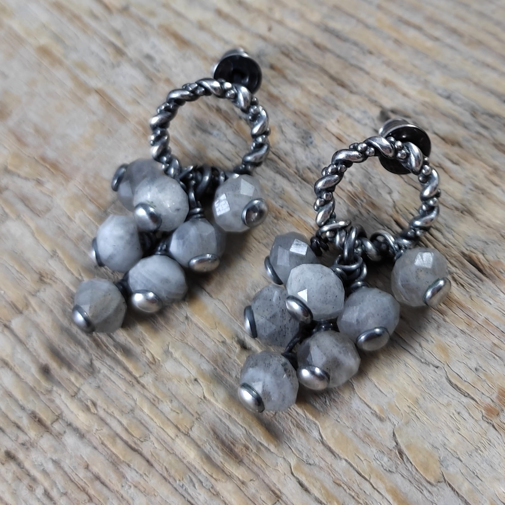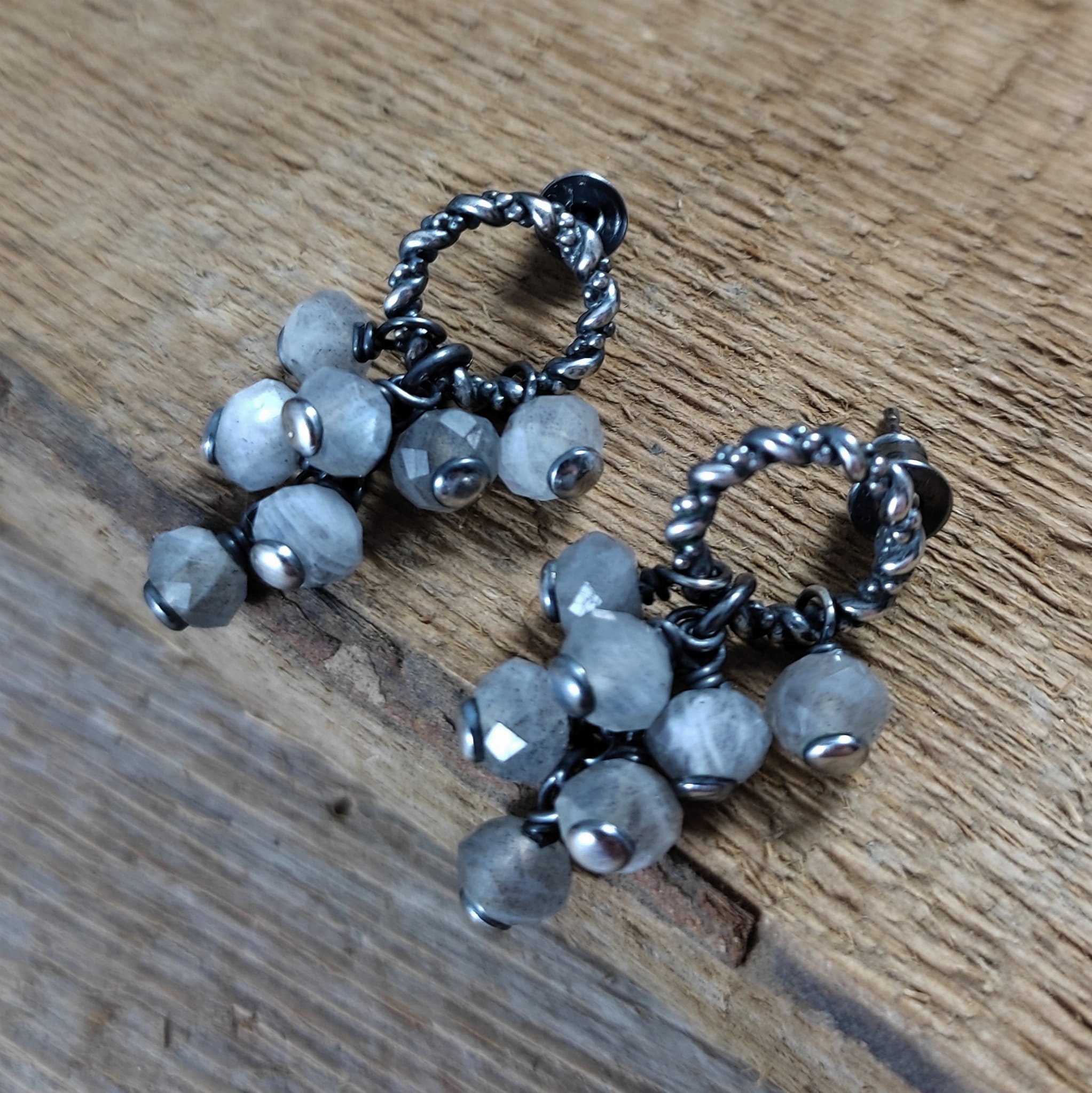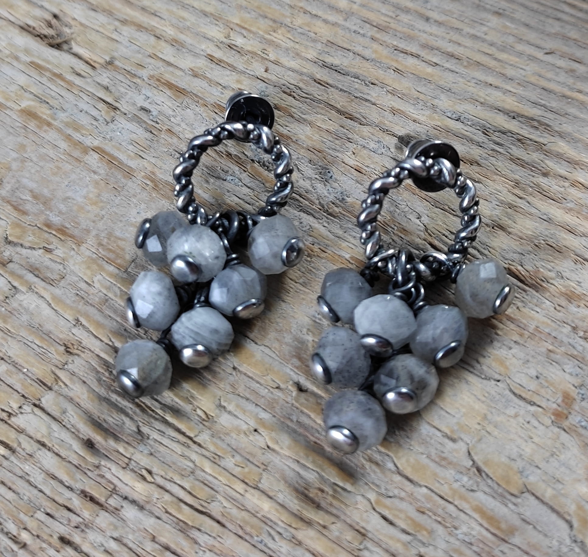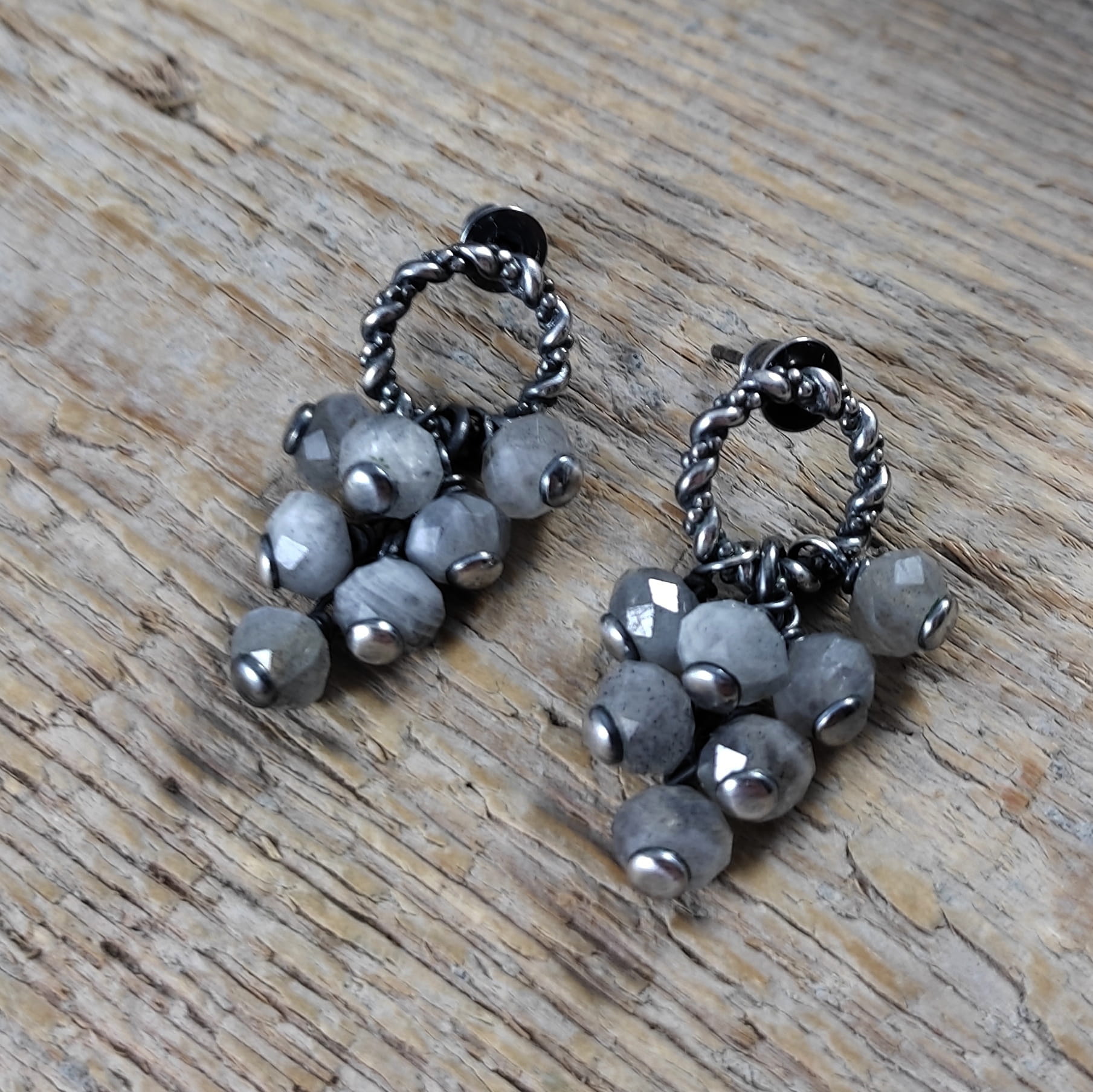 Kolczyki wykonane z oponek labradorytu ok. 6 mm. Całość oprawiona w srebro 925, oksydowane i wypolerowane. Długość całkowita kolczyków wynosi ok. 3 cm. Elegancko zapakowane.
