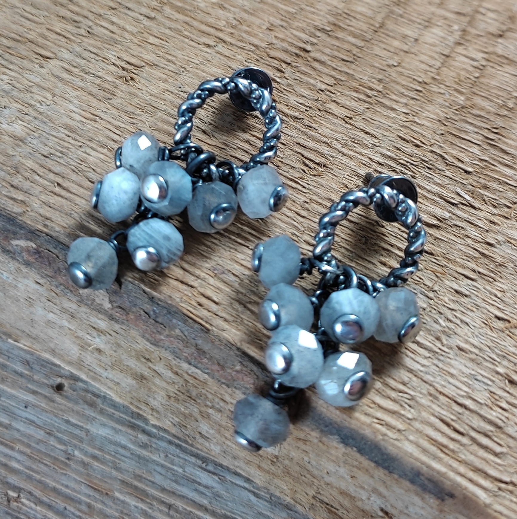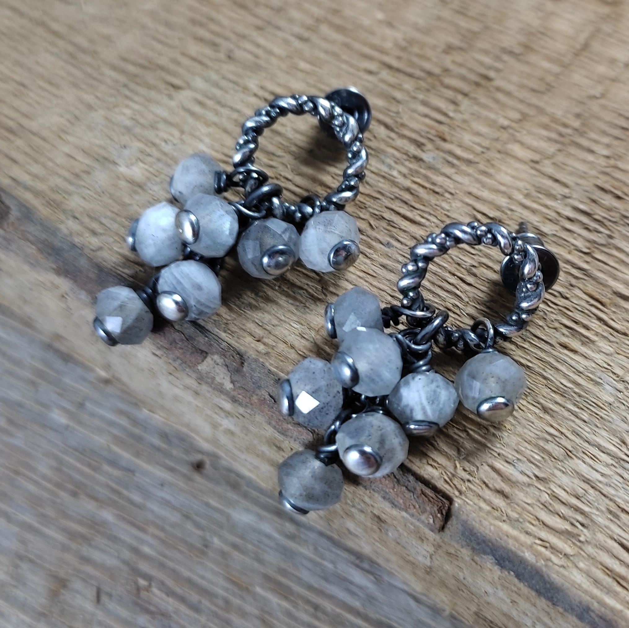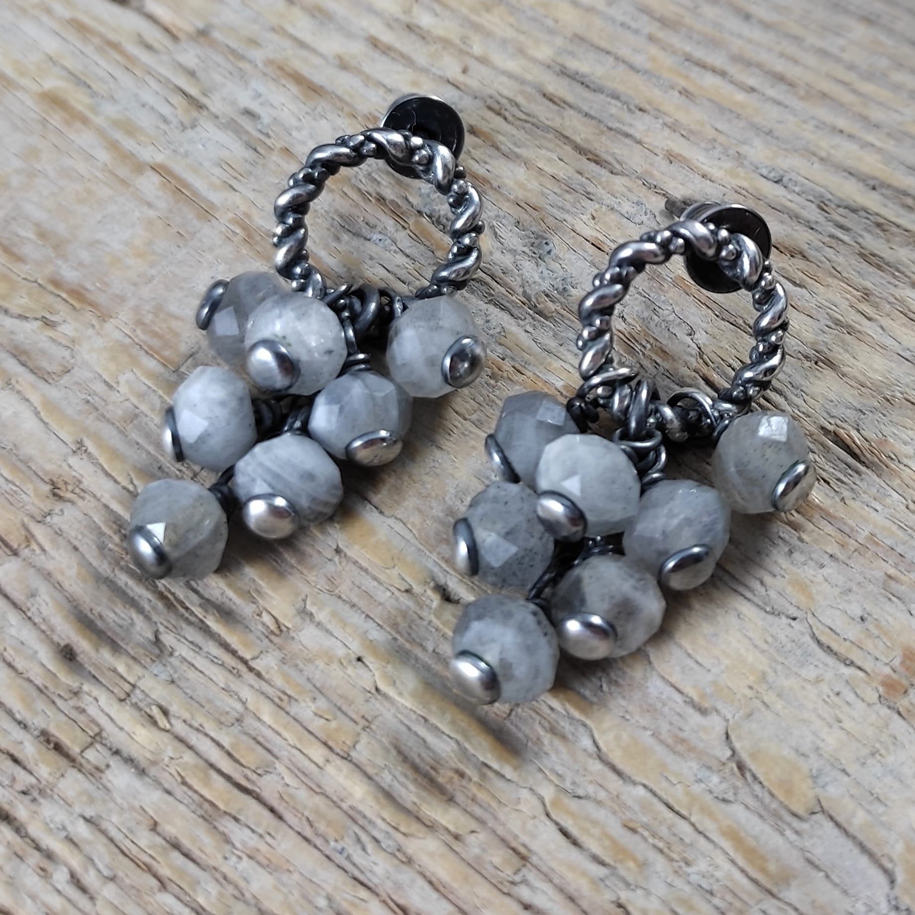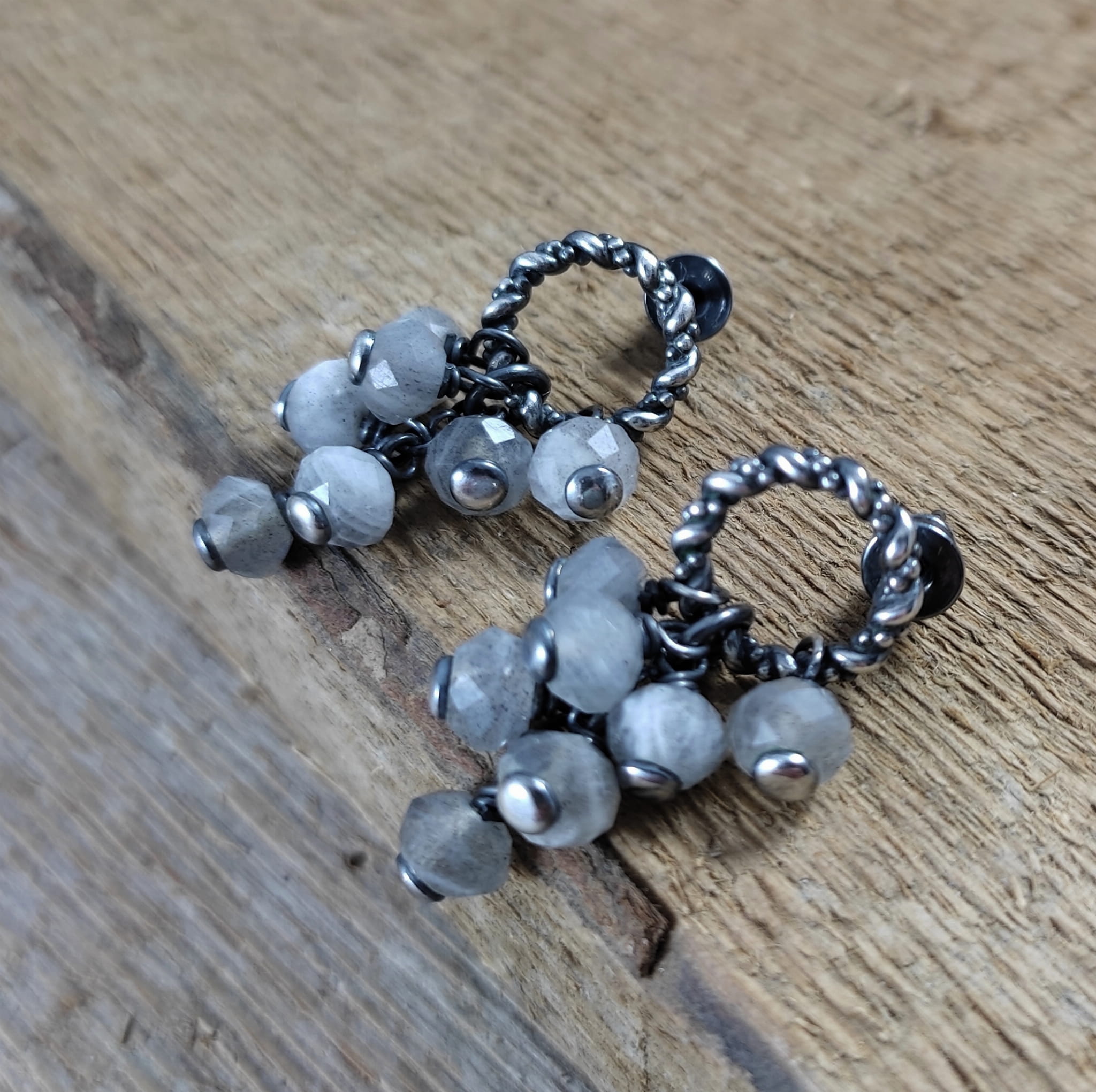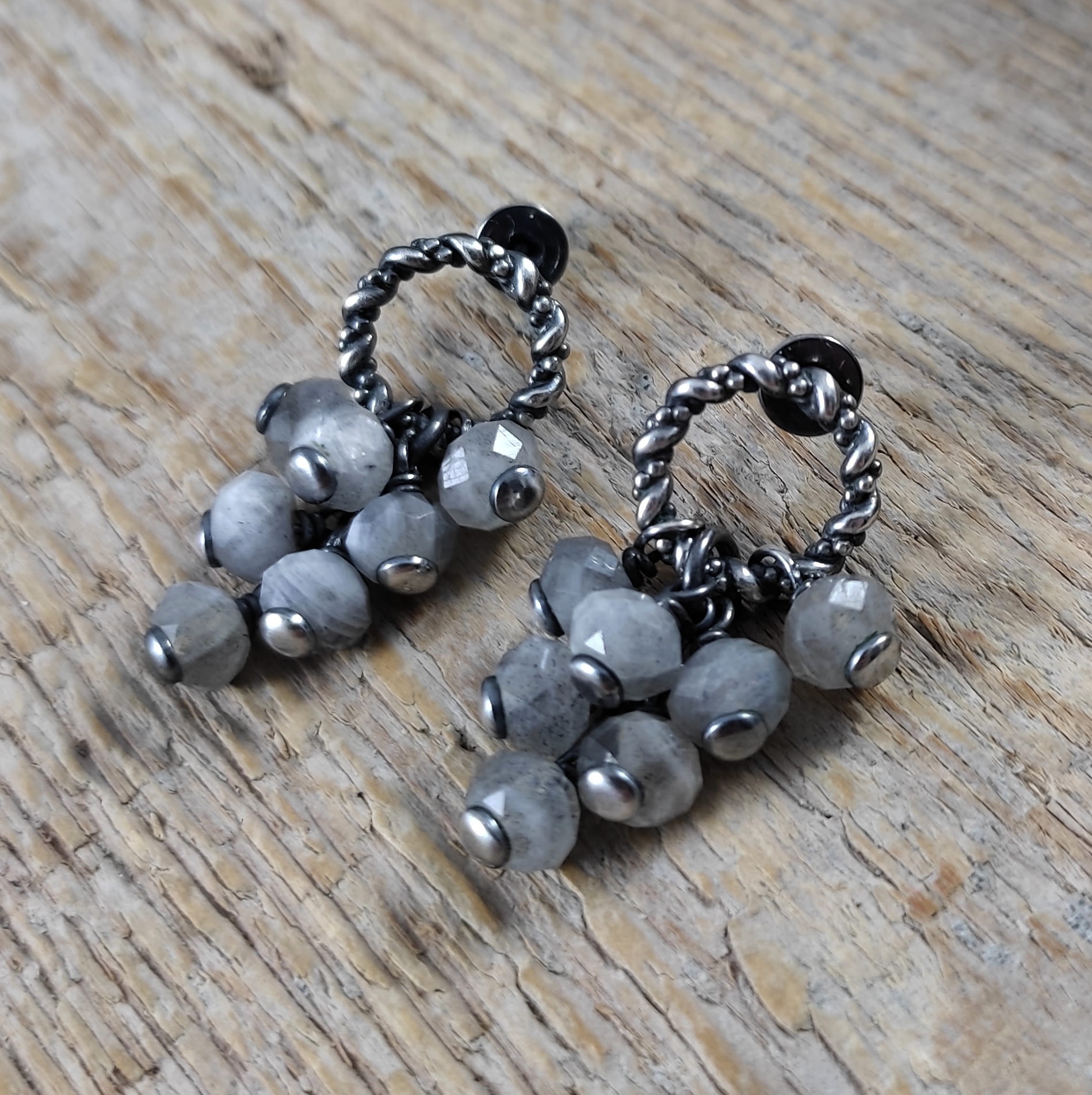 Kolczyki wykonane z oponek labradorytu ok. 6 mm. Całość oprawiona w srebro 925, oksydowane i wypolerowane. Długość całkowita kolczyków wynosi ok. 3 cm. Elegancko zapakowane.