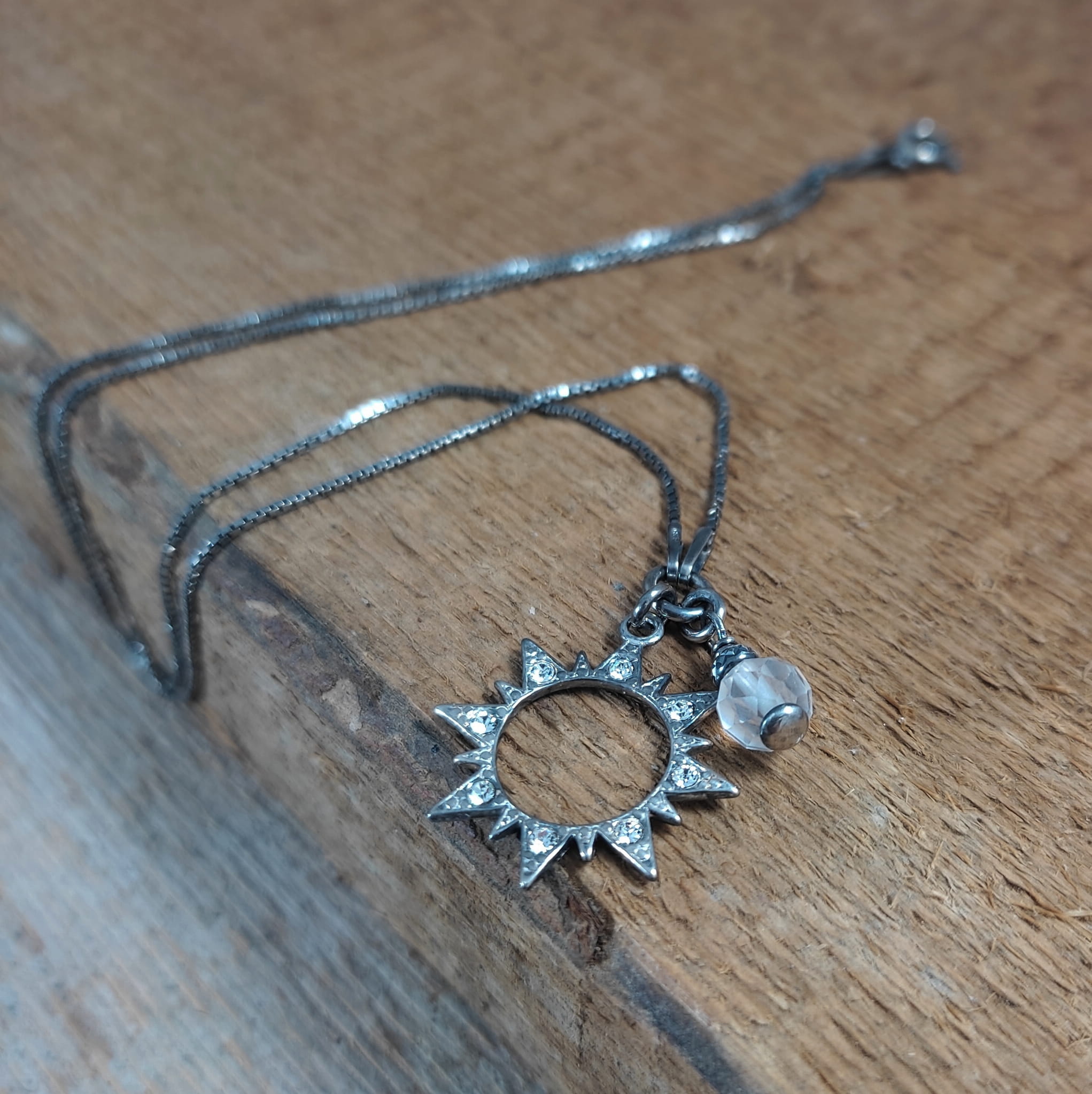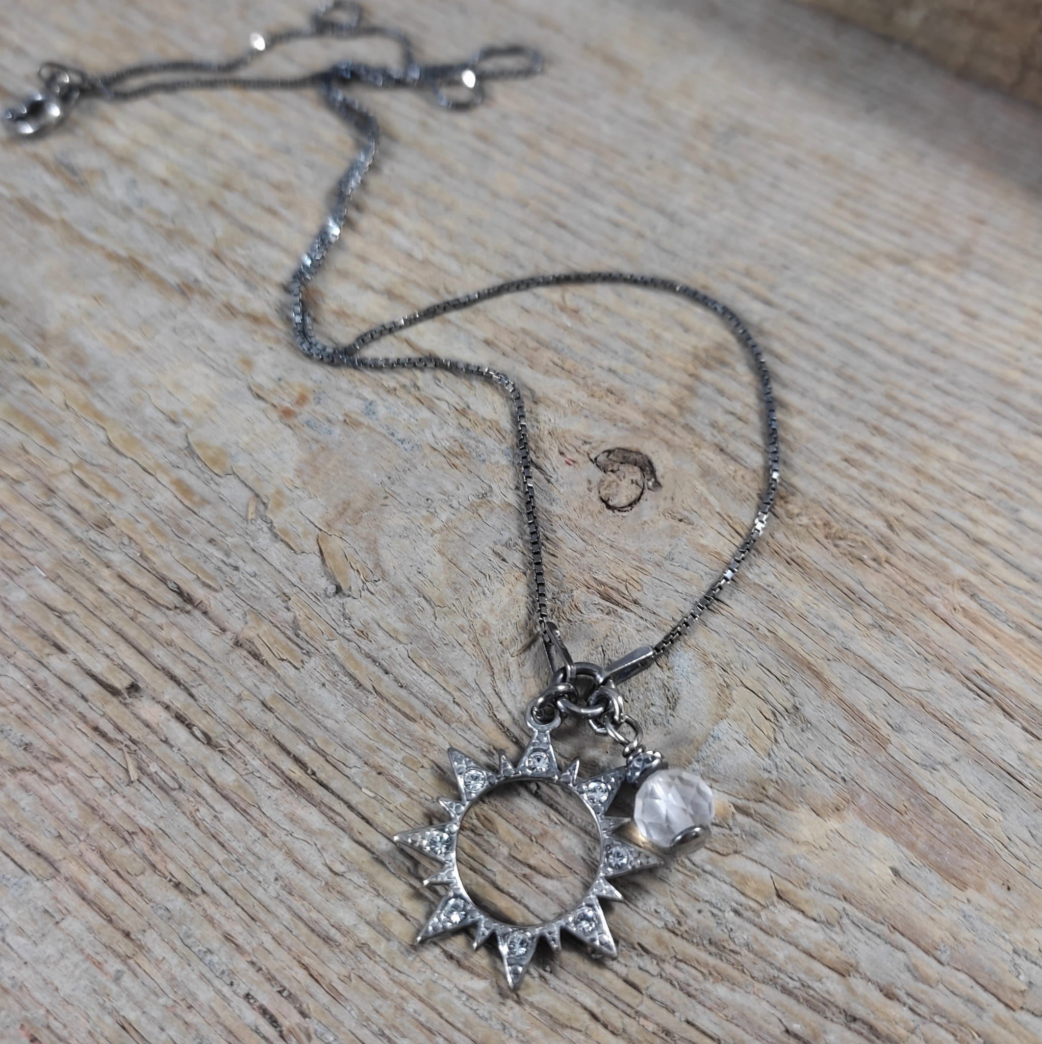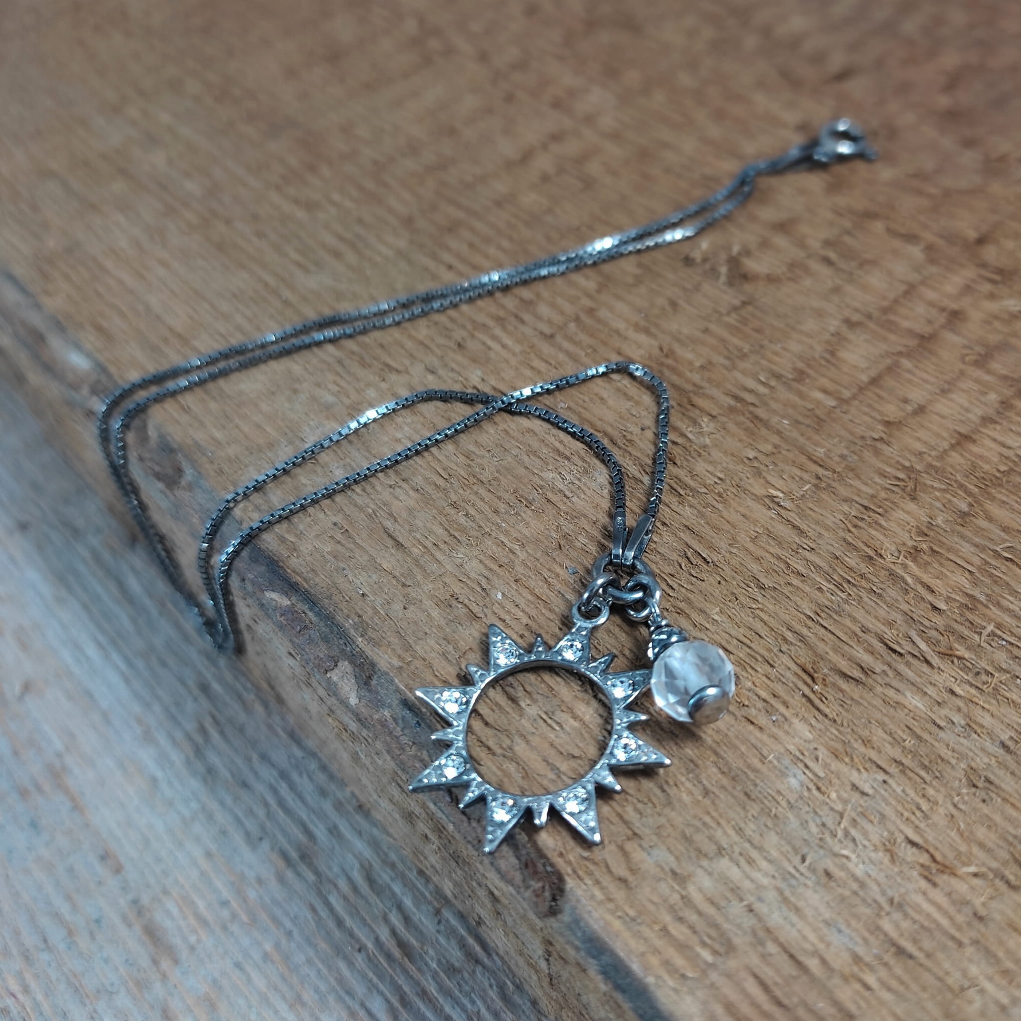 Naszyjnik/wisiorek wykonany ze srebra 925 oraz fasetowanej kuli kwarcu. Srebro oksydowane i wypolerowane. Długość naszyjnika wynosi ok. 41 cm, plus łańcuszek regulacyjny 5 cm. Elegancko zapakowany.