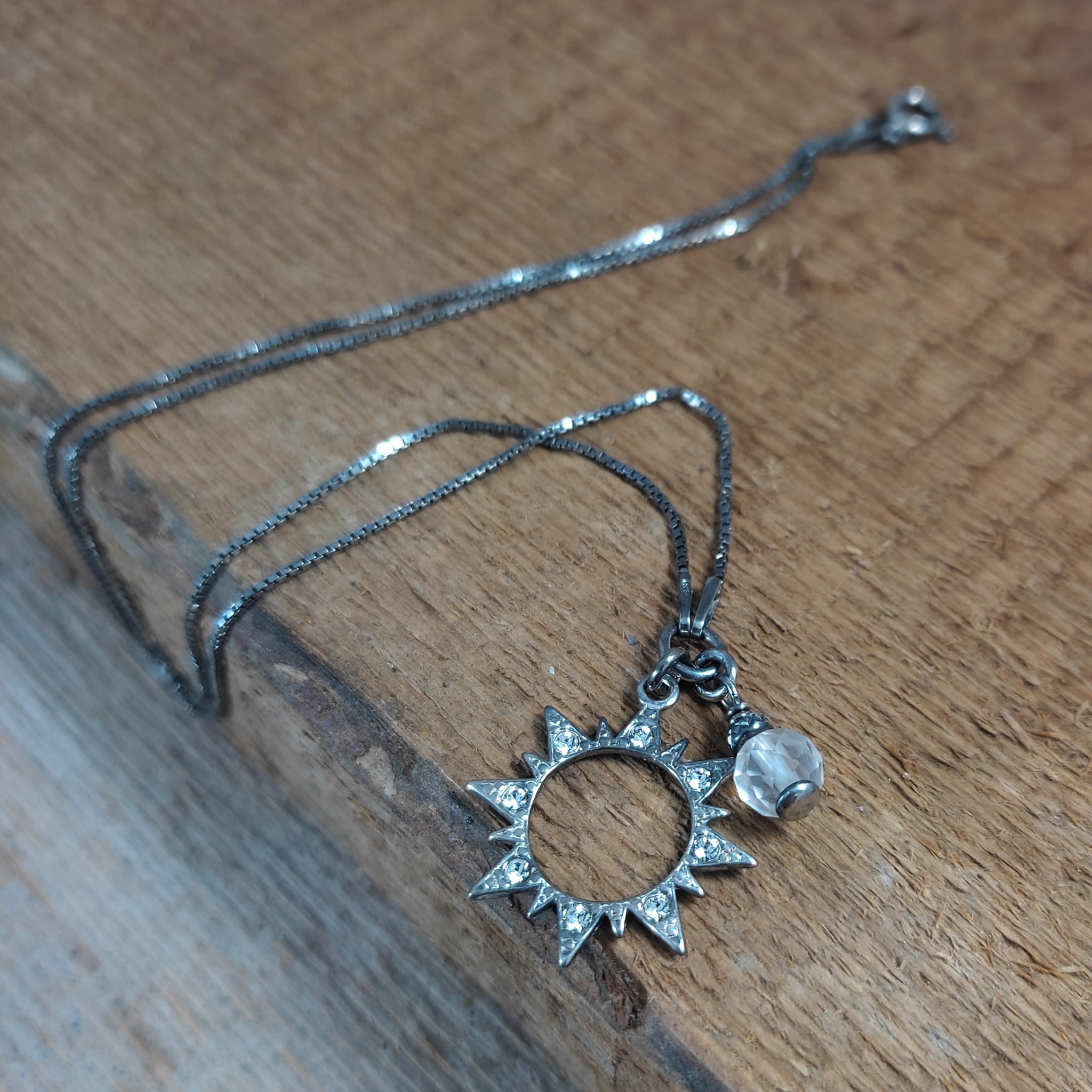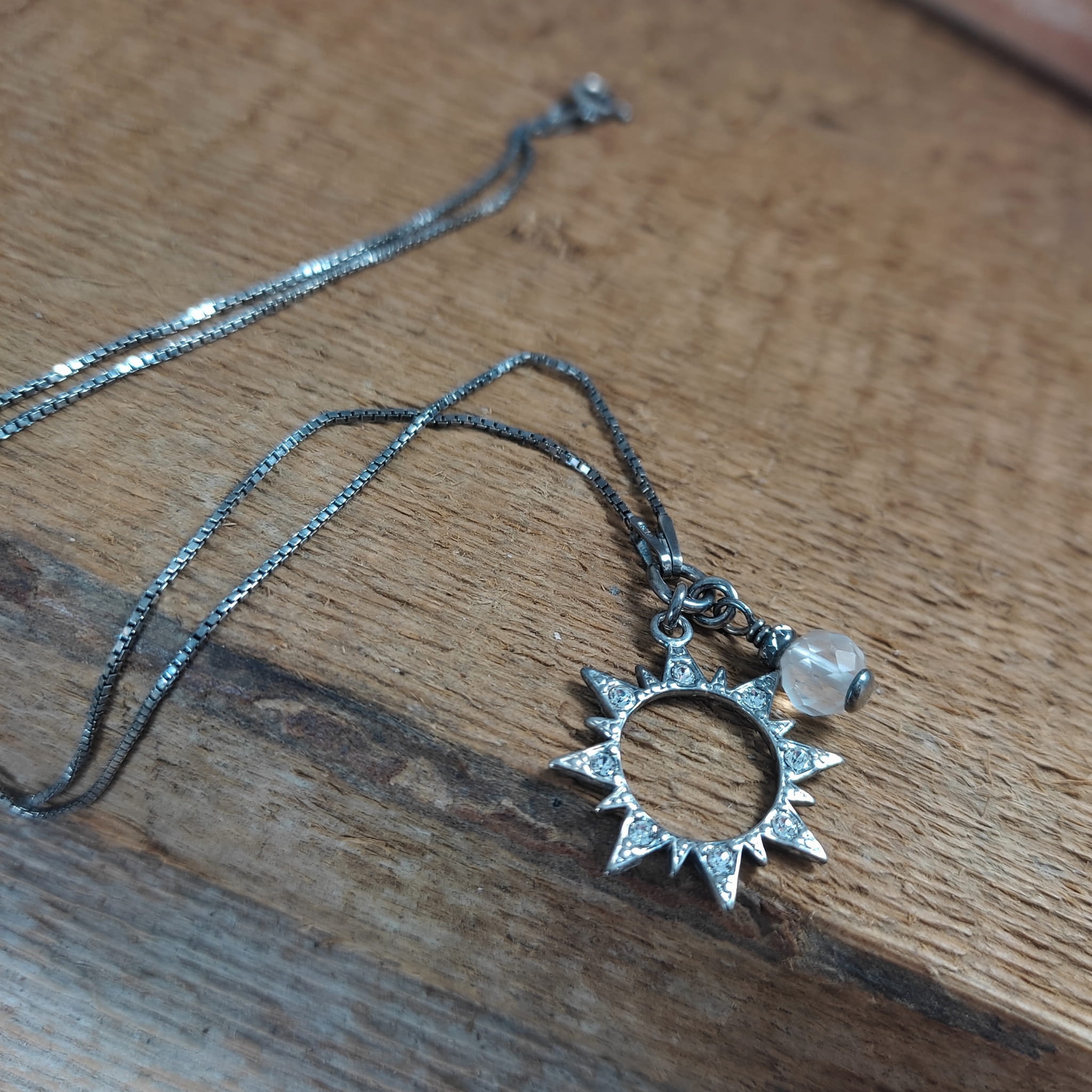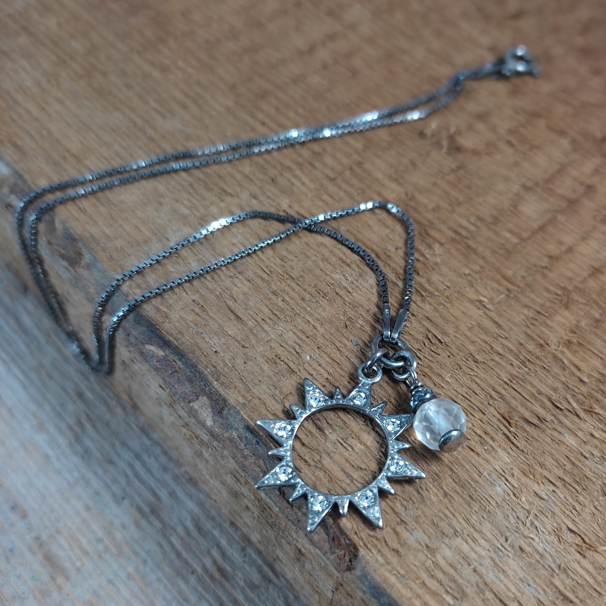 Naszyjnik/wisiorek wykonany ze srebra 925 oraz fasetowanej kuli kwarcu. Srebro oksydowane i wypolerowane. Długość naszyjnika wynosi ok. 41 cm, plus łańcuszek regulacyjny 5 cm. Elegancko zapakowany.
