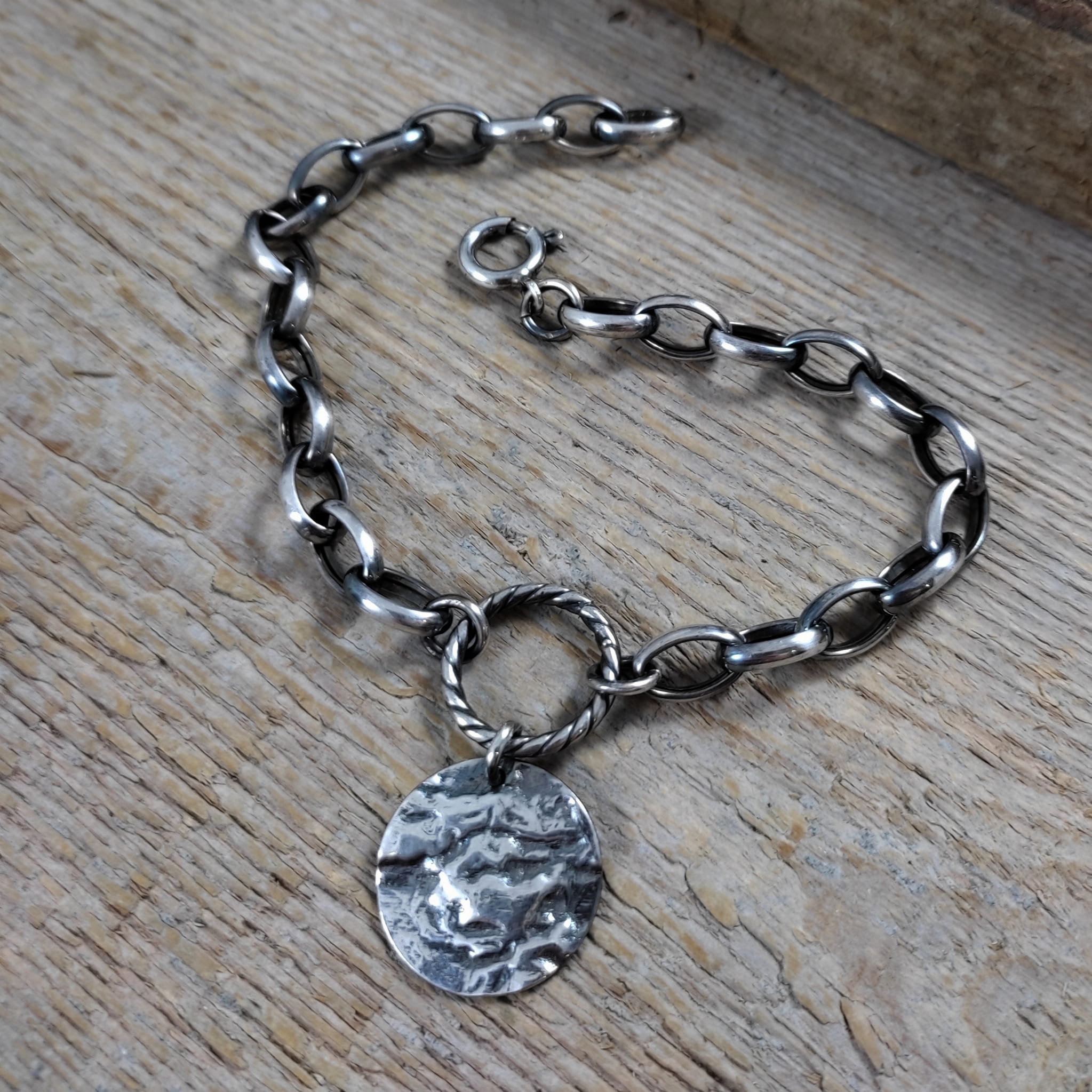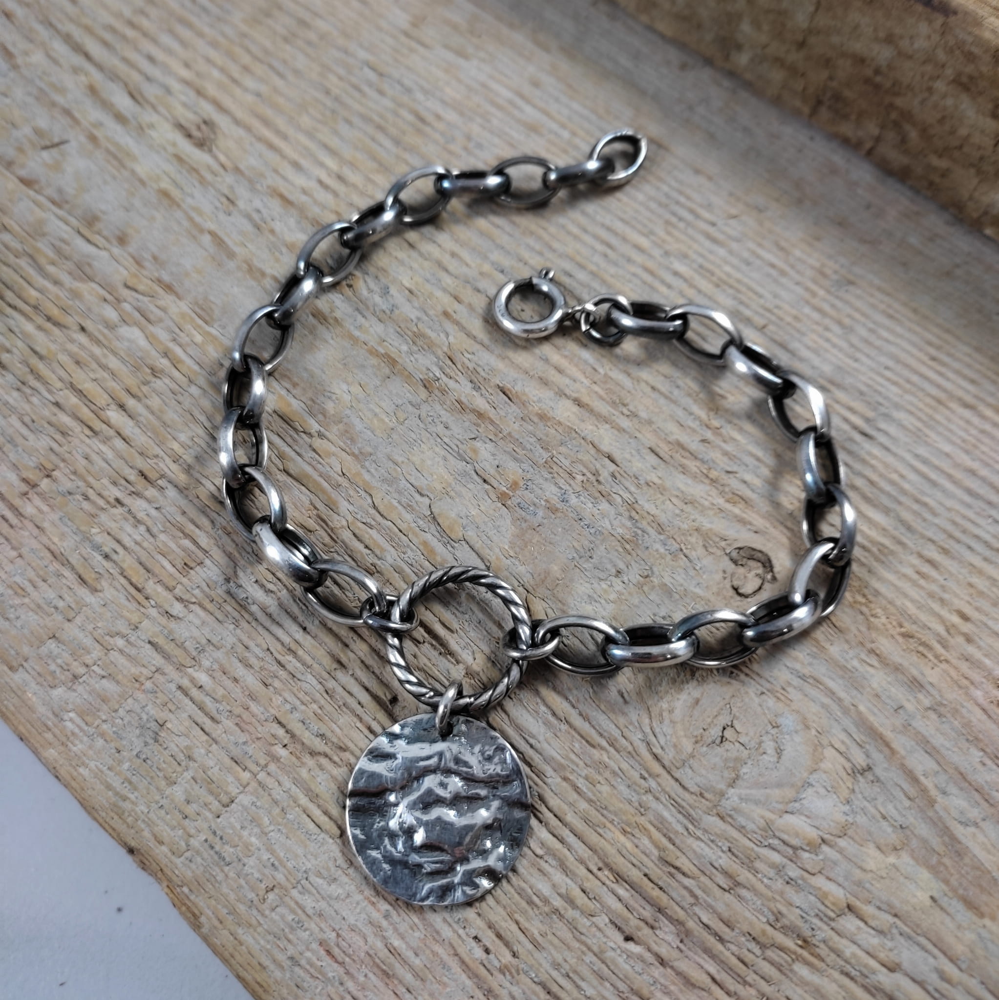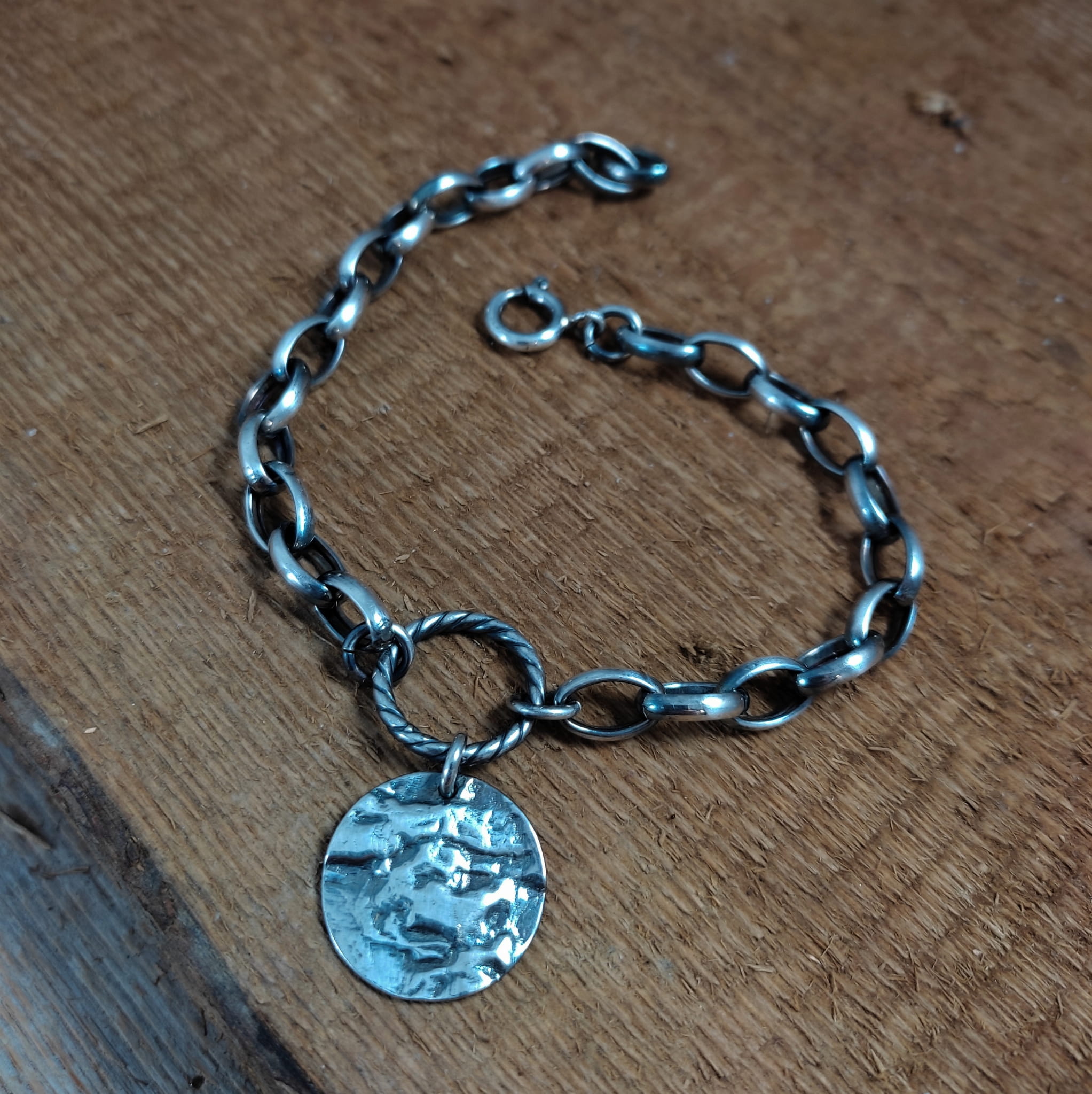 Bransoletka wykonana ze srebra próby 925, oksydowanego i wypolerowanego. Zawieszkę stanowi blaszka o średnicy 19 mm. Wielkości ogniwek łańcucha wynoszą 7/10 mm oraz 3,5/7 mm. Długość maksymalna bransoletki wynosi ok. 23 cm. Elegancko zapakowana.