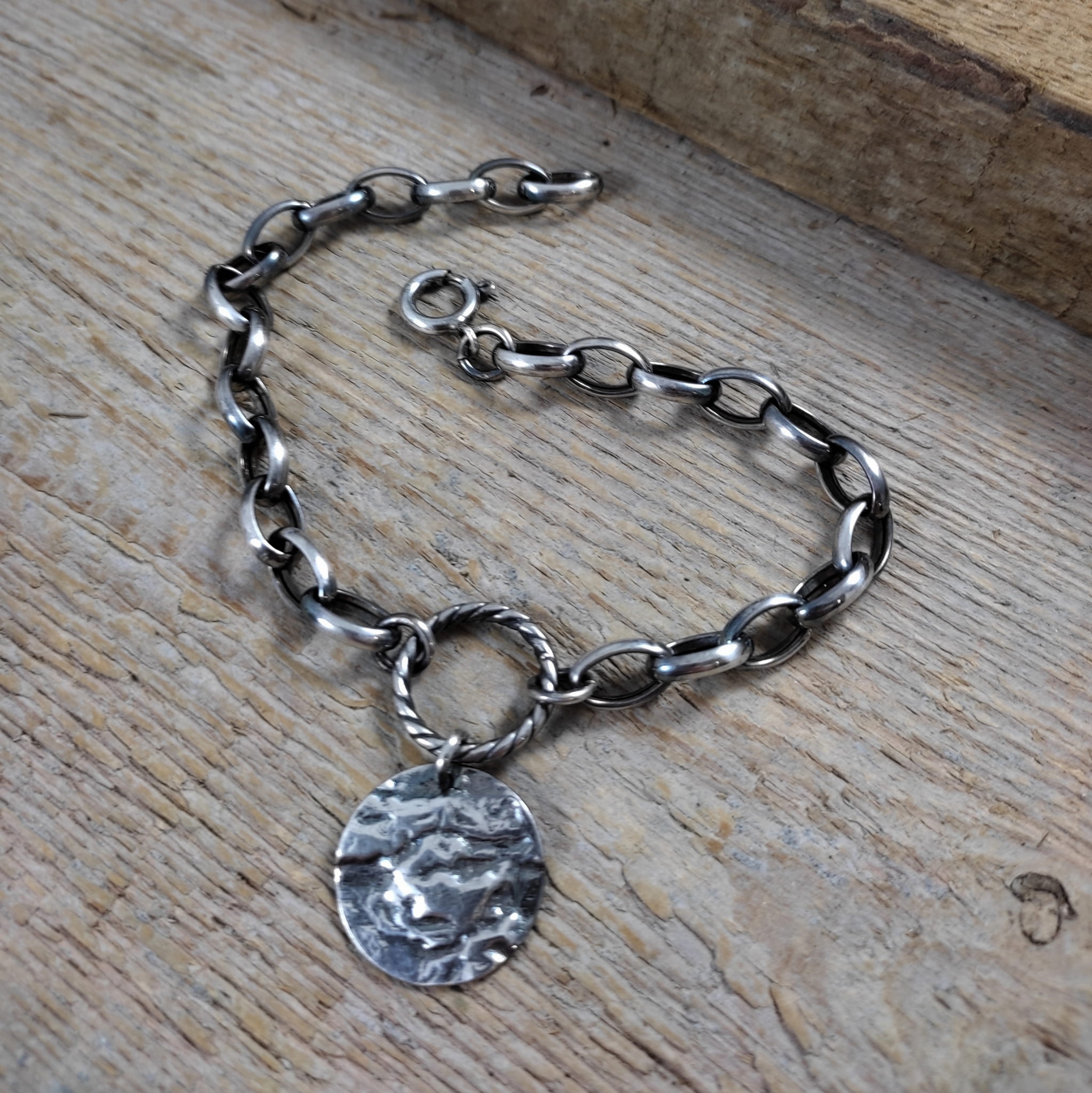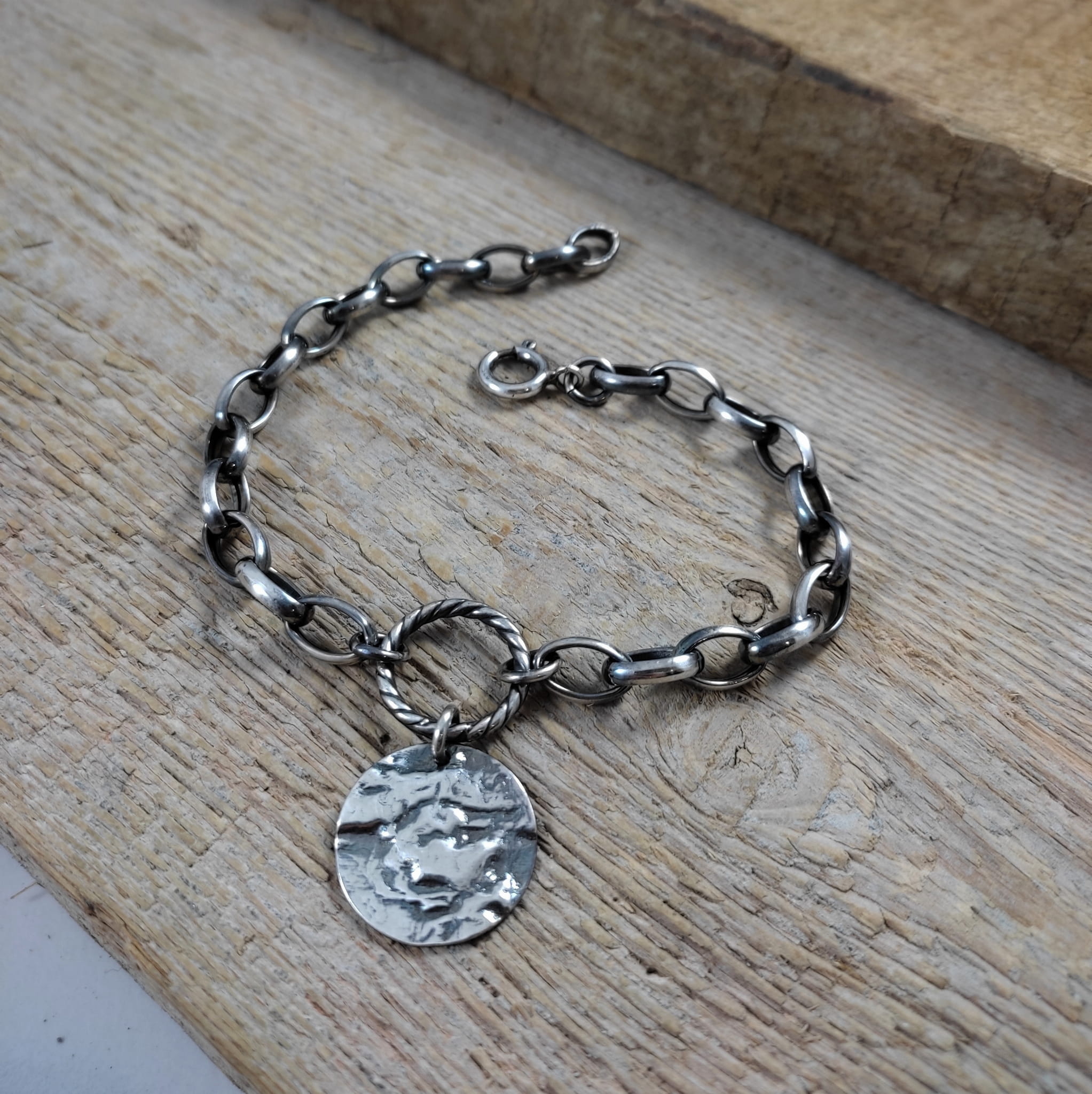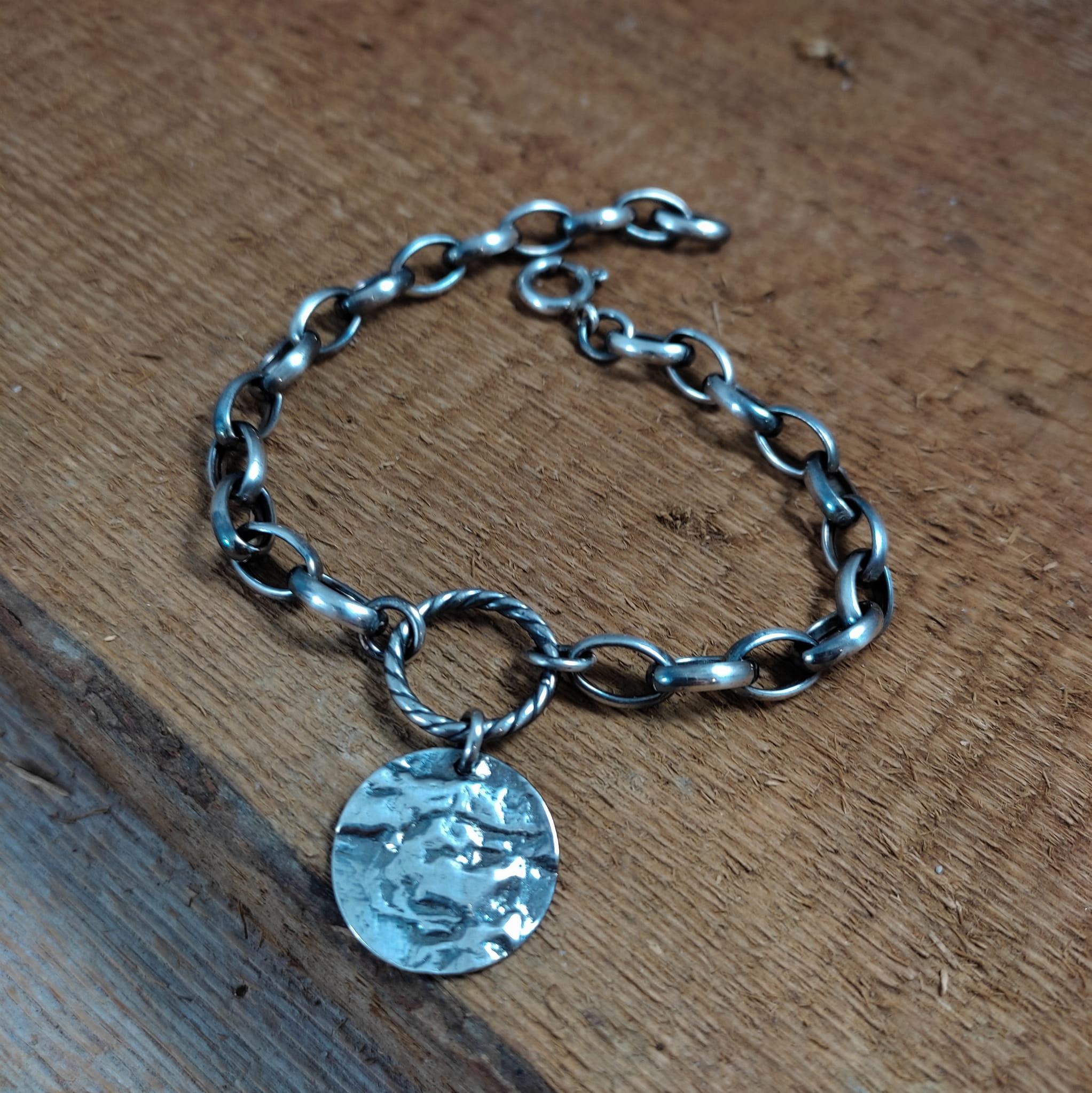 Bransoletka wykonana ze srebra próby 925, oksydowanego i wypolerowanego. Zawieszkę stanowi blaszka o średnicy 19 mm. Wielkości ogniwek łańcucha wynoszą 7/10 mm oraz 3,5/7 mm. Długość maksymalna bransoletki wynosi ok. 23 cm. Elegancko zapakowana.