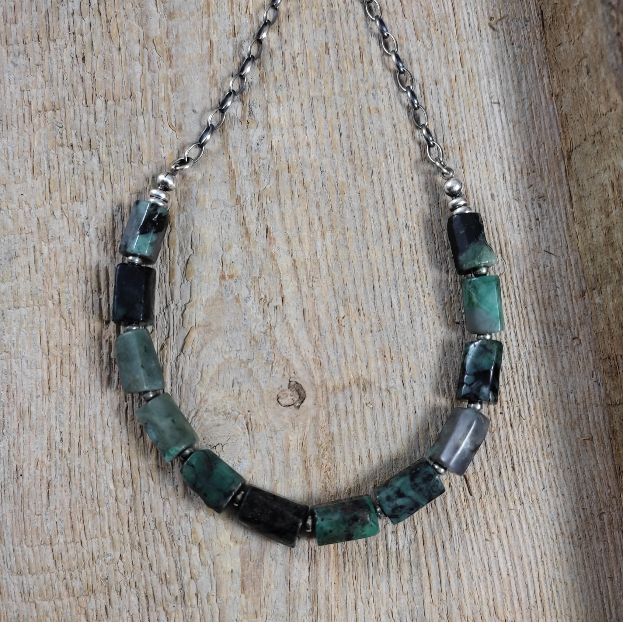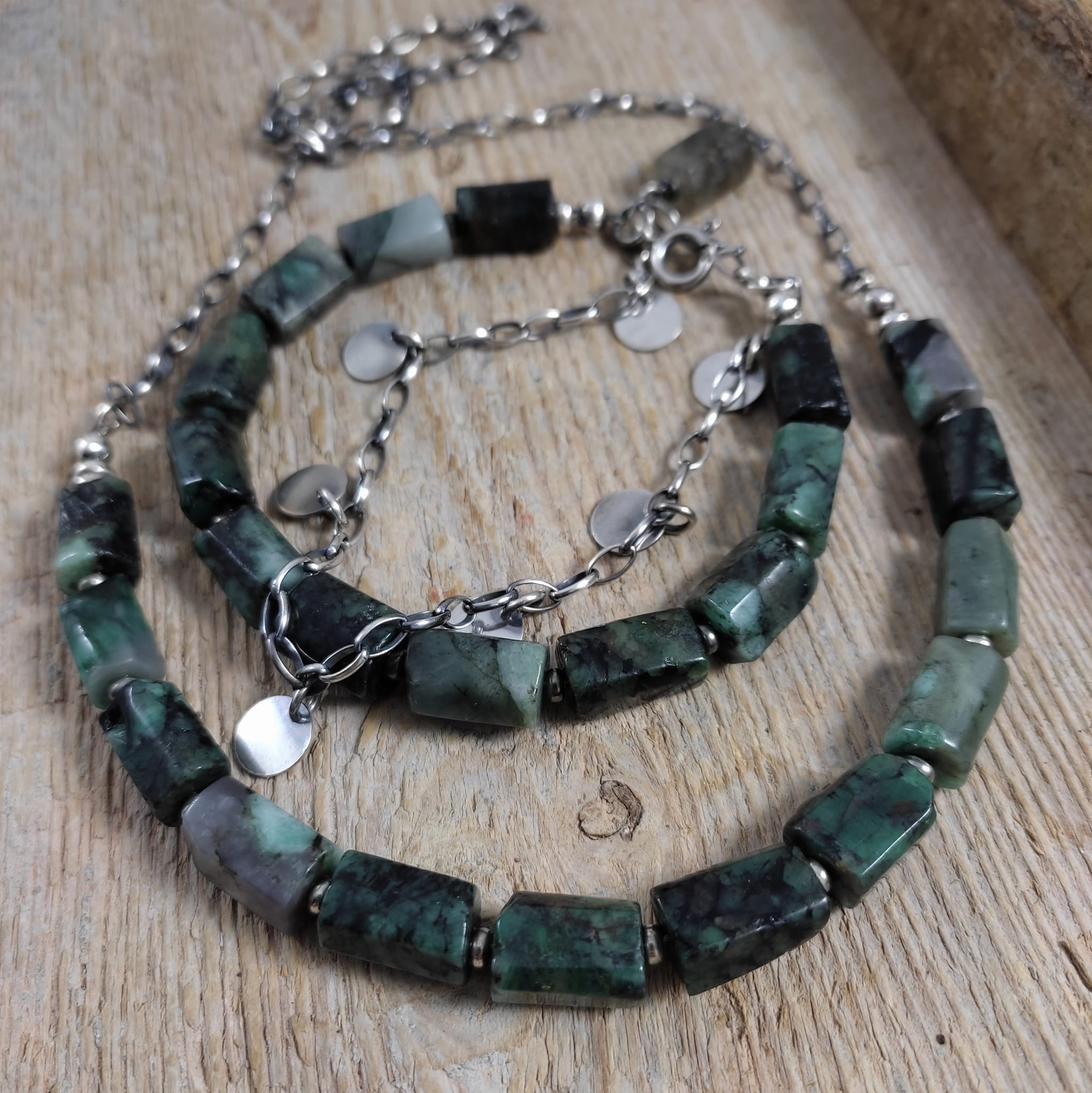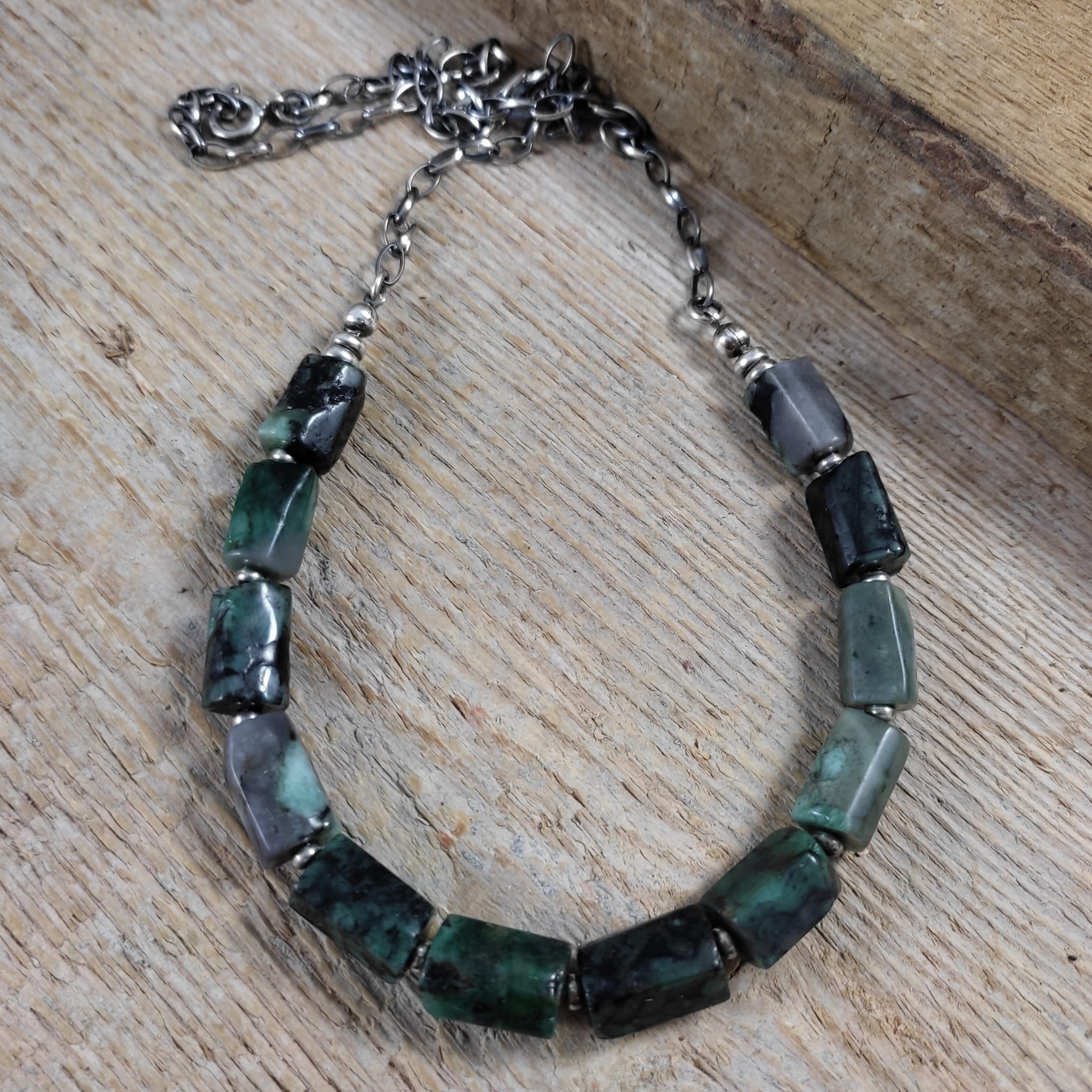 Naszyjnik wykonany z nieregularnych bryłek szmaragdu ok. 9/12 mm. Całość dopełniona srebrem 925, oksydowanym i wypolerowanym. Długość naszyjnika wynosi ok. 50 cm, możliwość regulacji. Elegancko zapakowany. Kamienie naturalne, nieregularne, posiadają niedoskonałości.