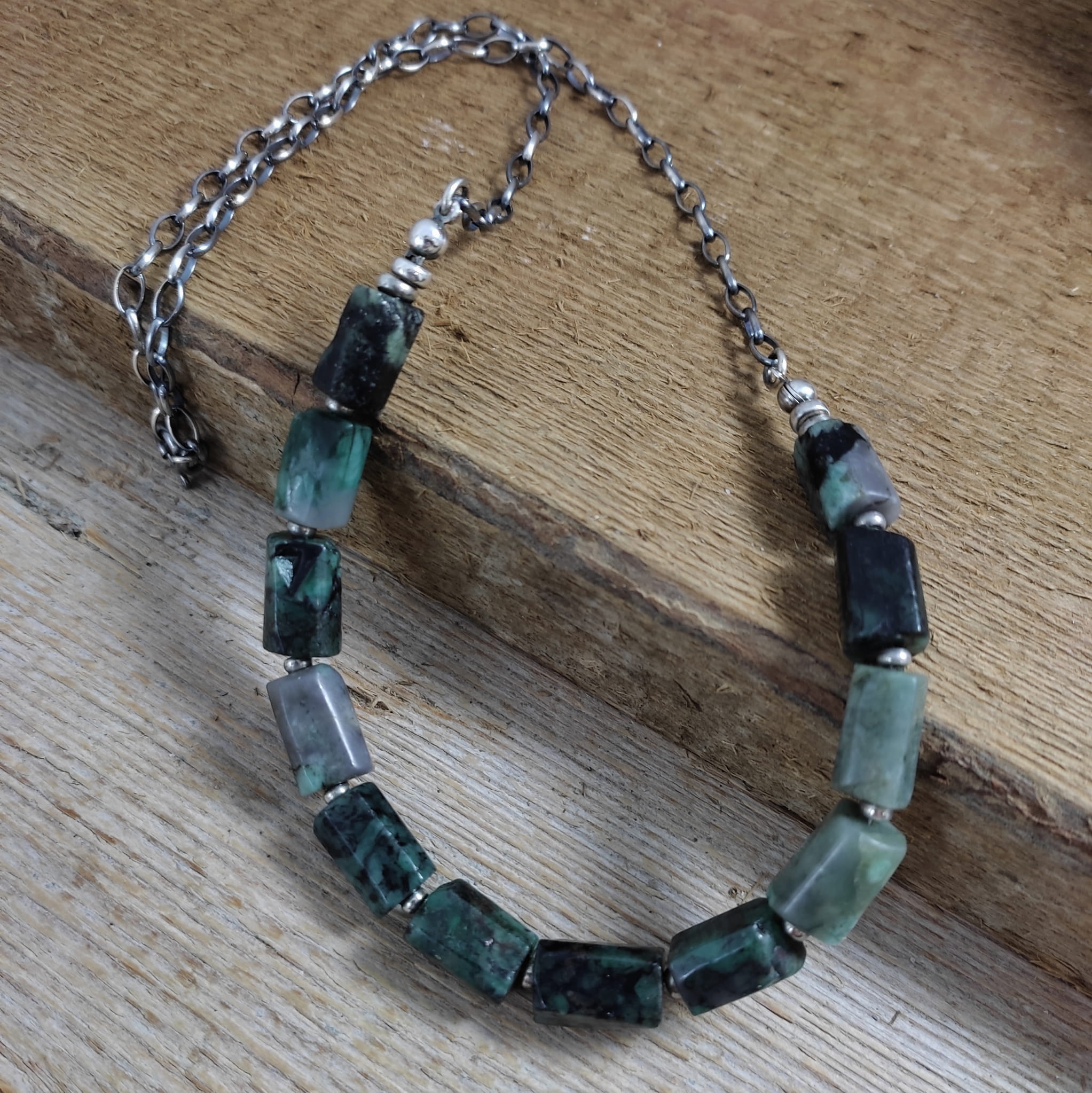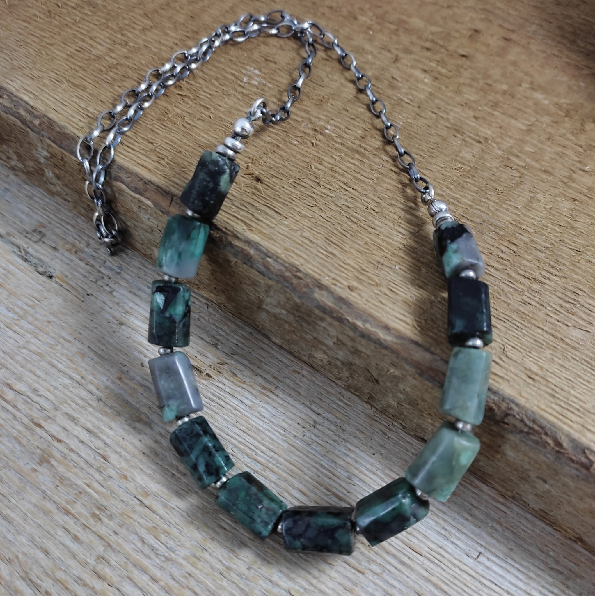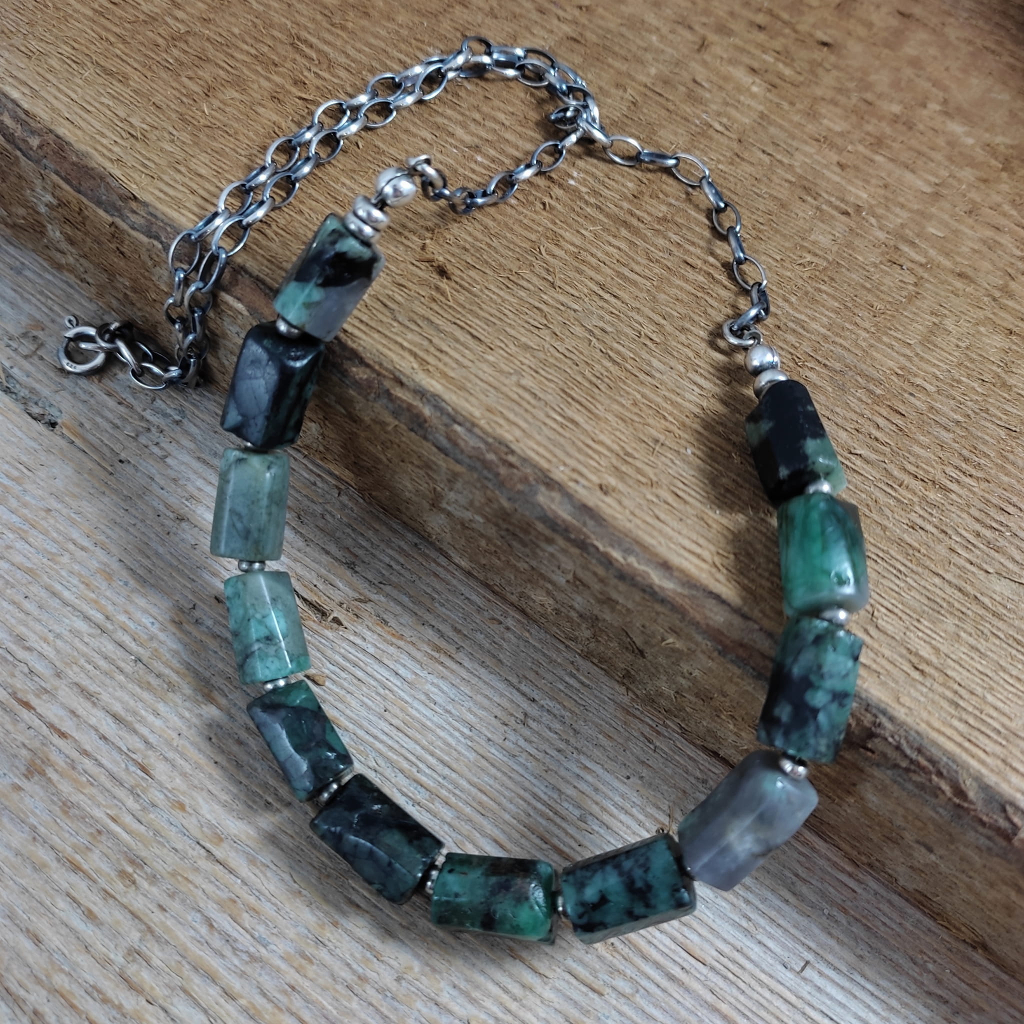 Naszyjnik wykonany z nieregularnych bryłek szmaragdu ok. 9/12 mm. Całość dopełniona srebrem 925, oksydowanym i wypolerowanym. Długość naszyjnika wynosi ok. 50 cm, możliwość regulacji. Elegancko zapakowany. Kamienie naturalne, nieregularne, posiadają niedoskonałości.