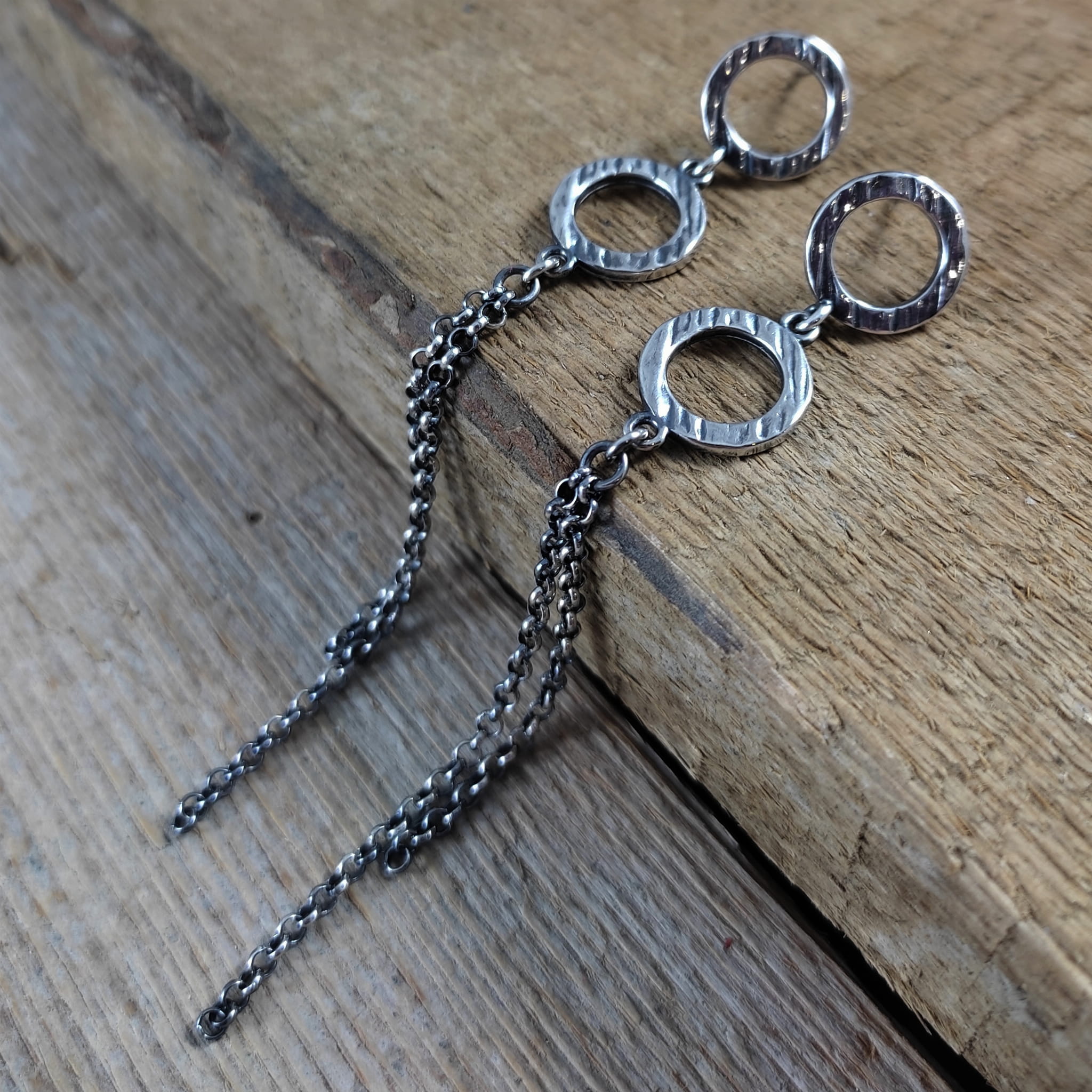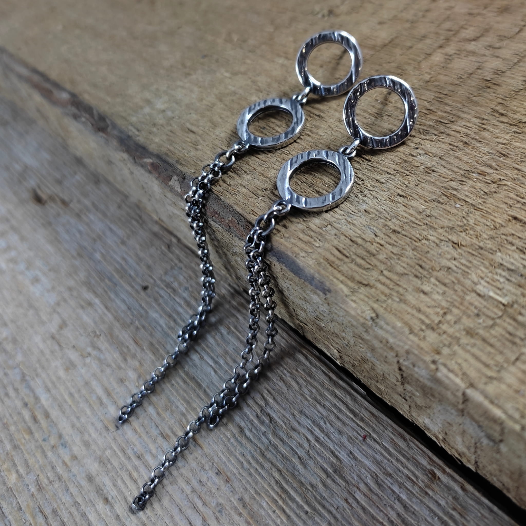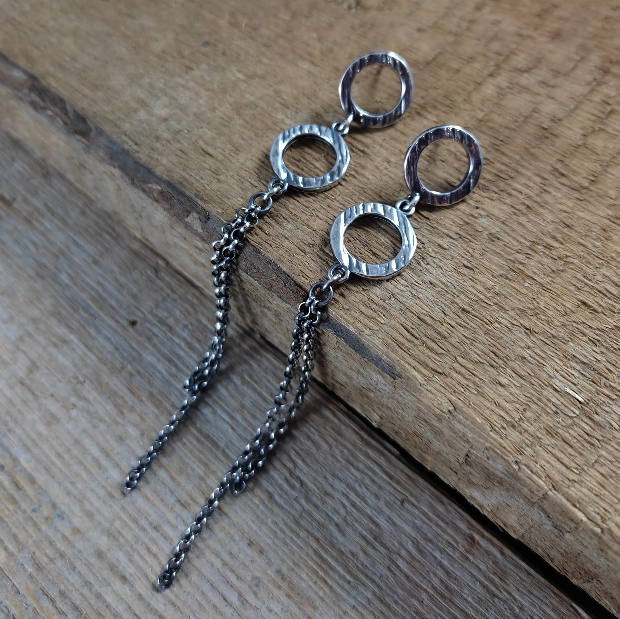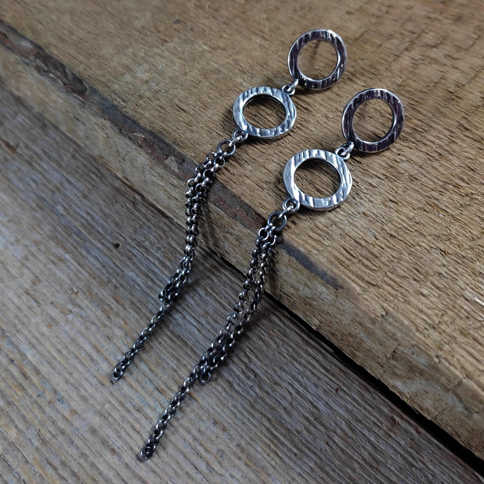 Kolczyki wykonane ze srebra 925, oksydowanego i wypolerowanego. Całkowita długość kolczyków wynosi ok. 9,5 cm. Wielkość srebrnych elementów/kół ok. 13 mm. Elegancko zapakowane.