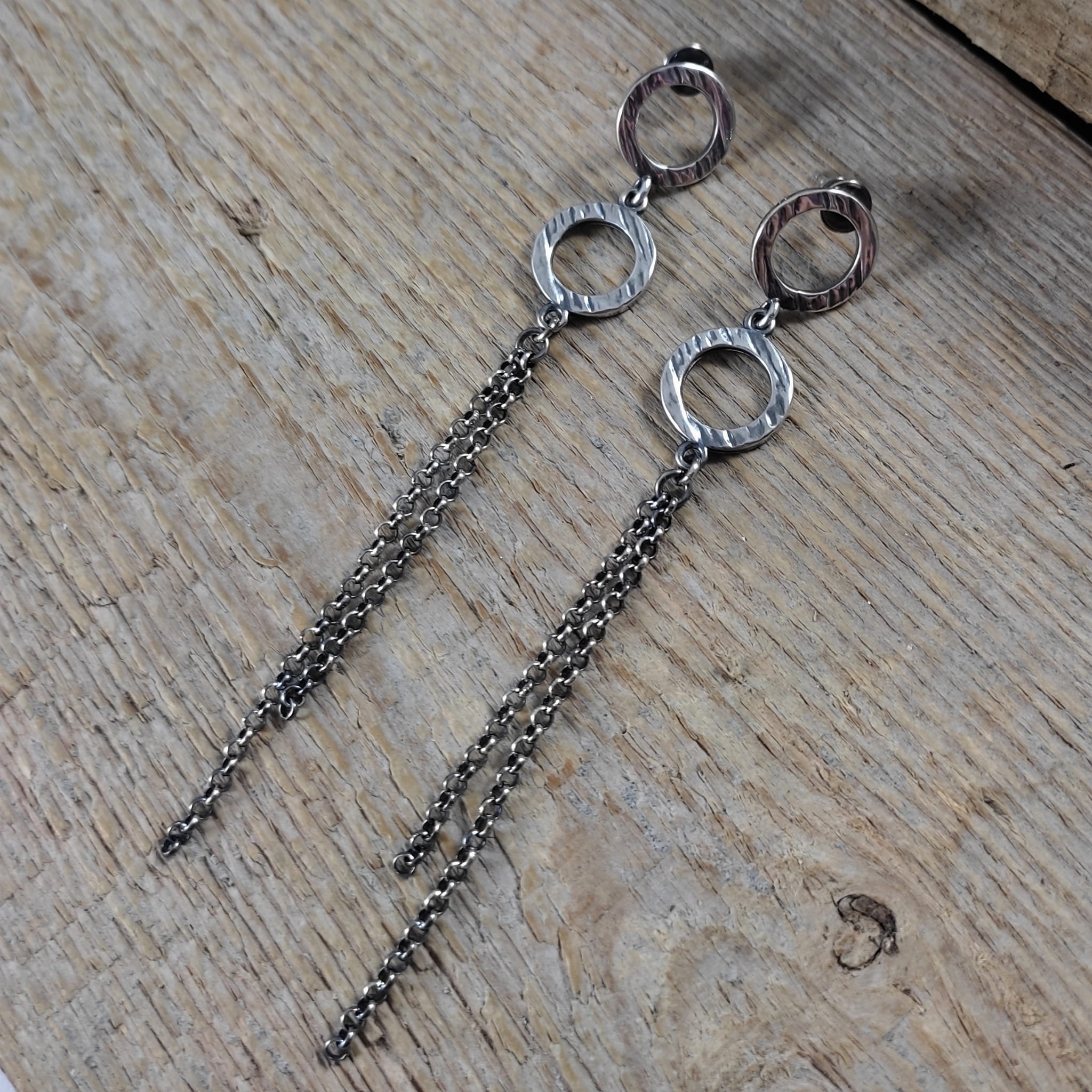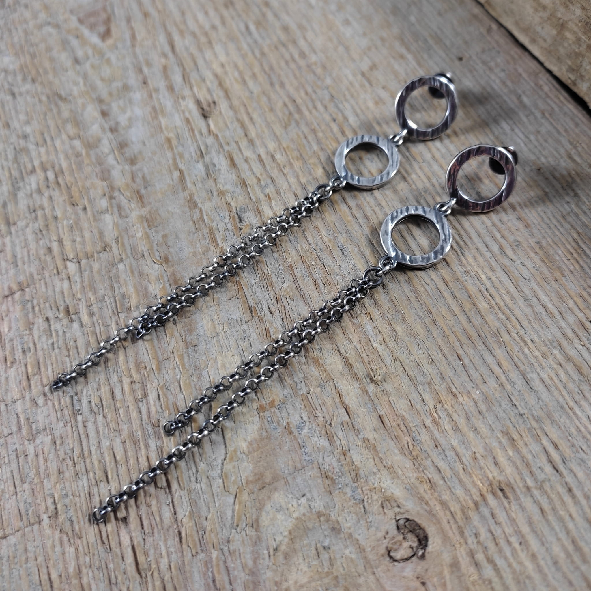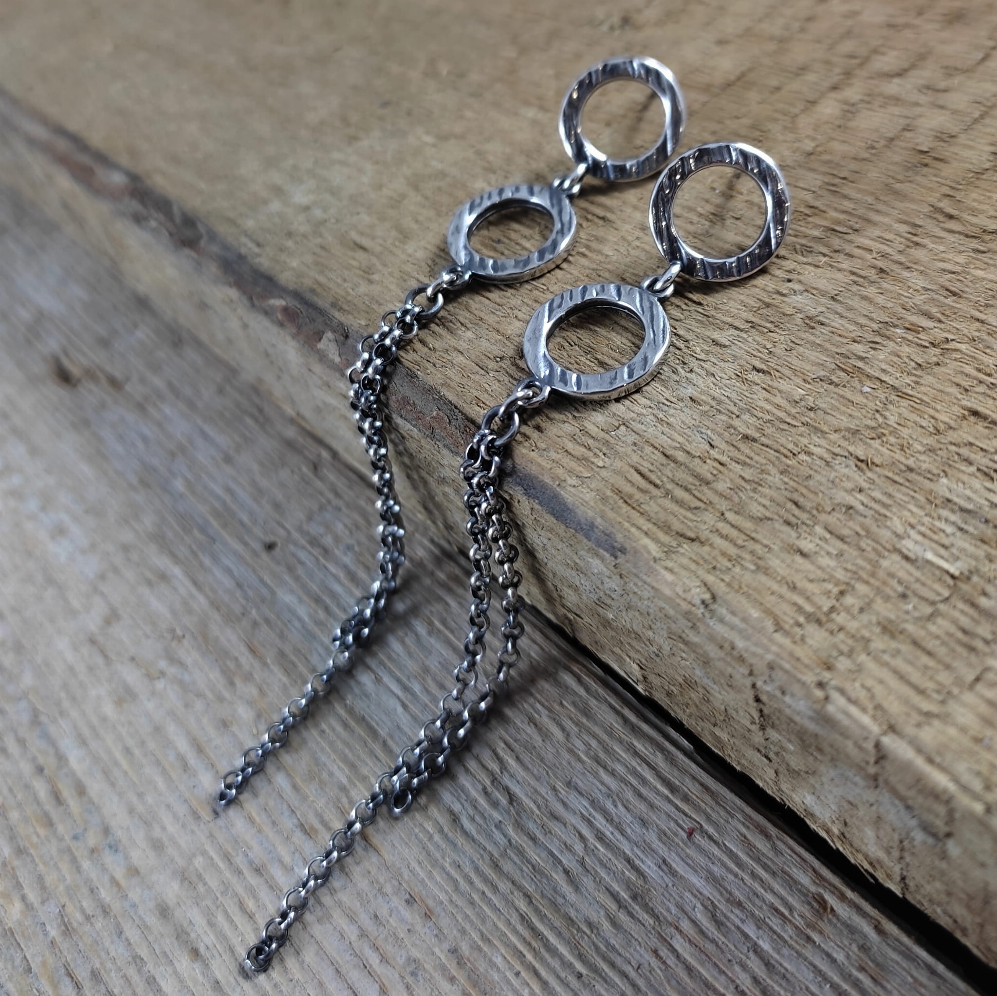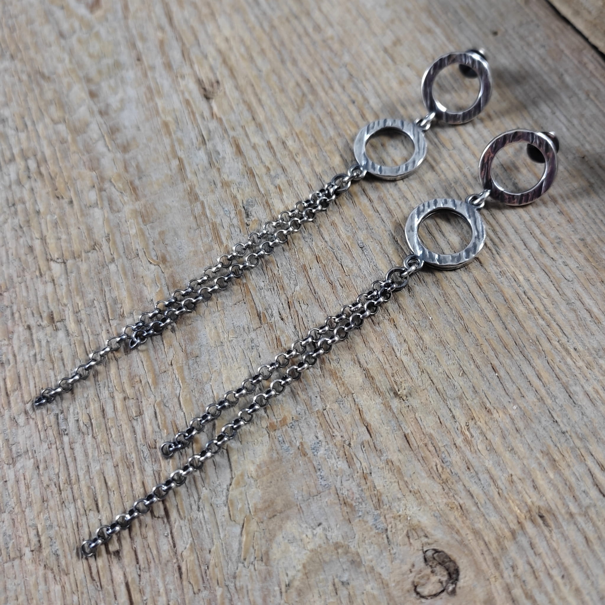 Kolczyki wykonane ze srebra 925, oksydowanego i wypolerowanego. Całkowita długość kolczyków wynosi ok. 9,5 cm. Wielkość srebrnych elementów/kół ok. 13 mm. Elegancko zapakowane.