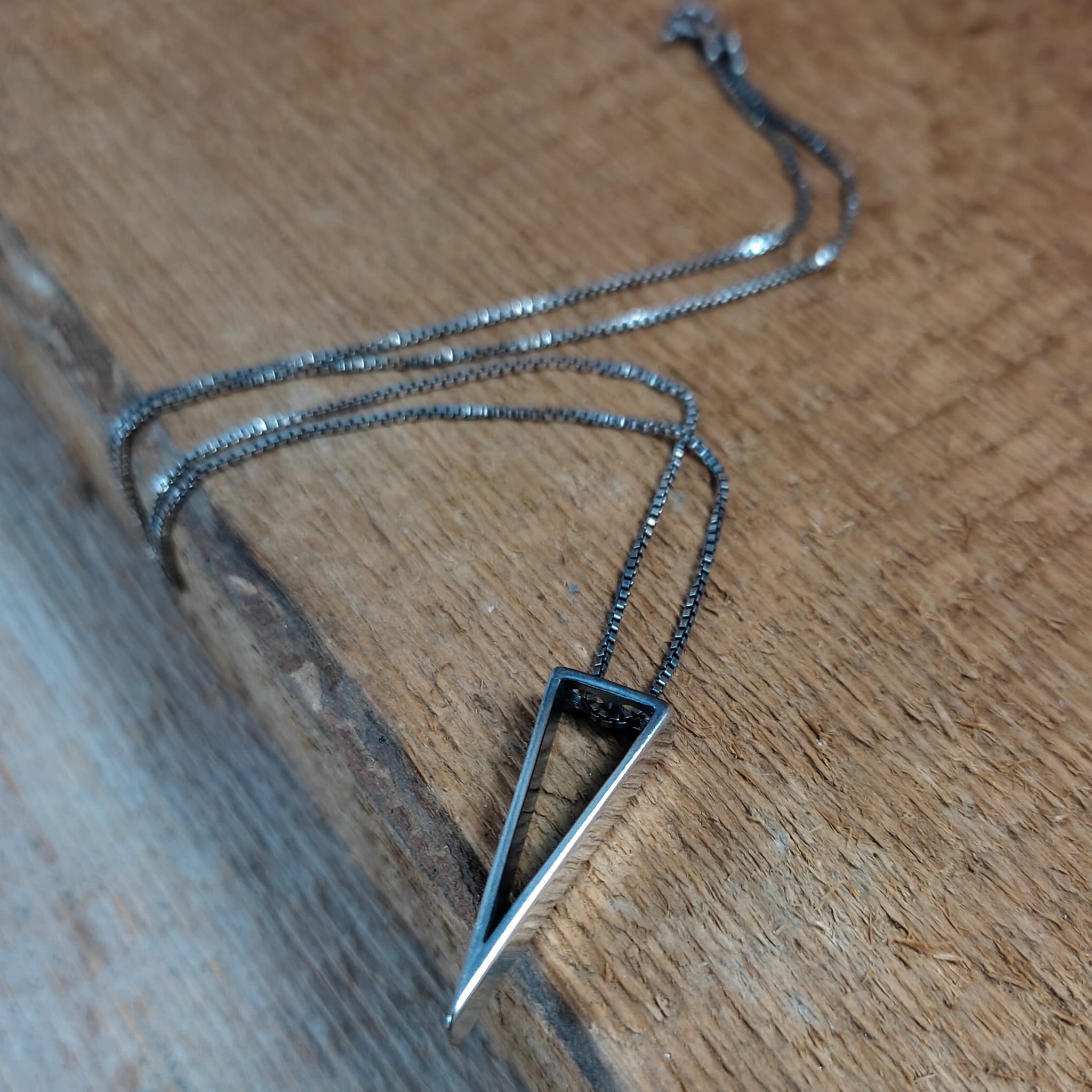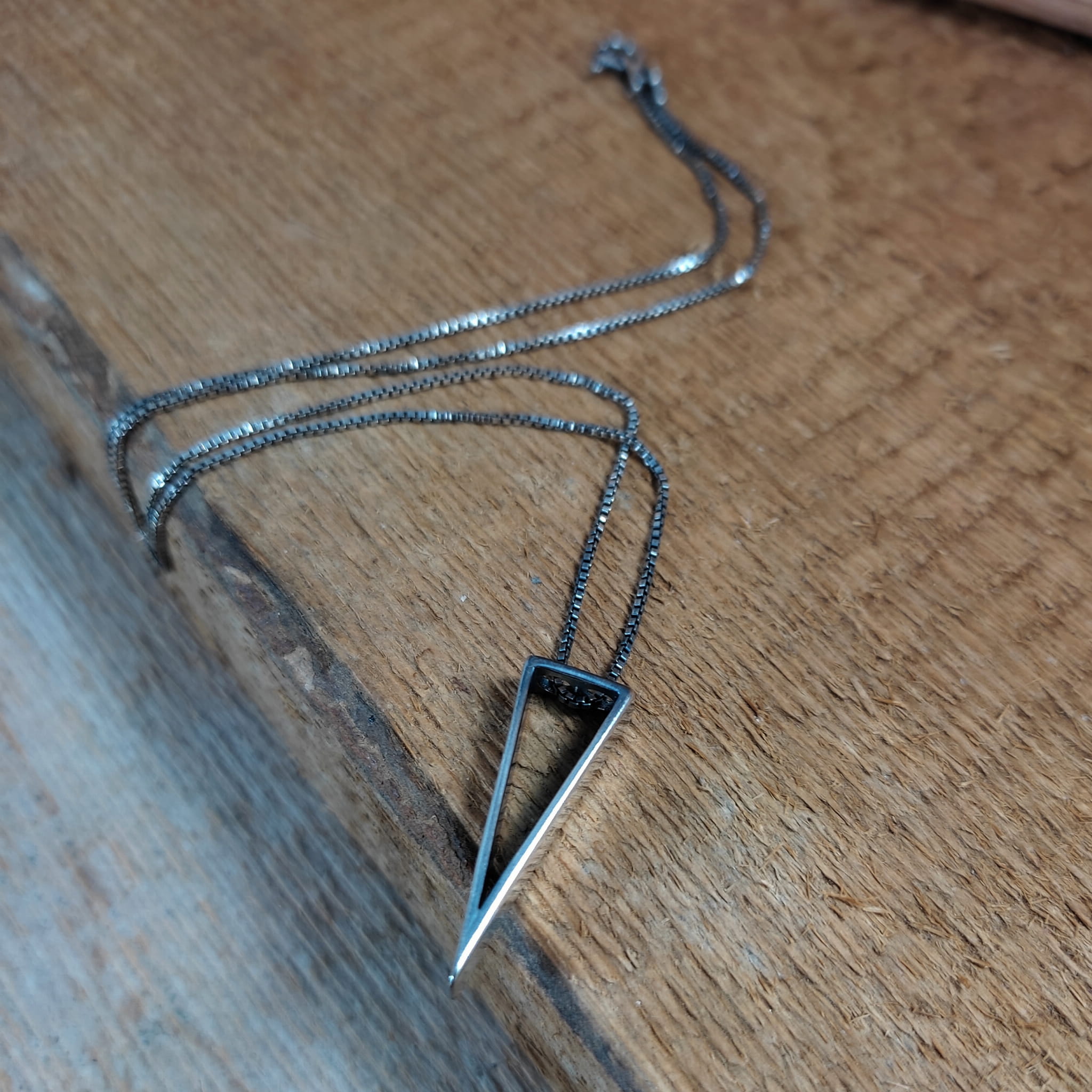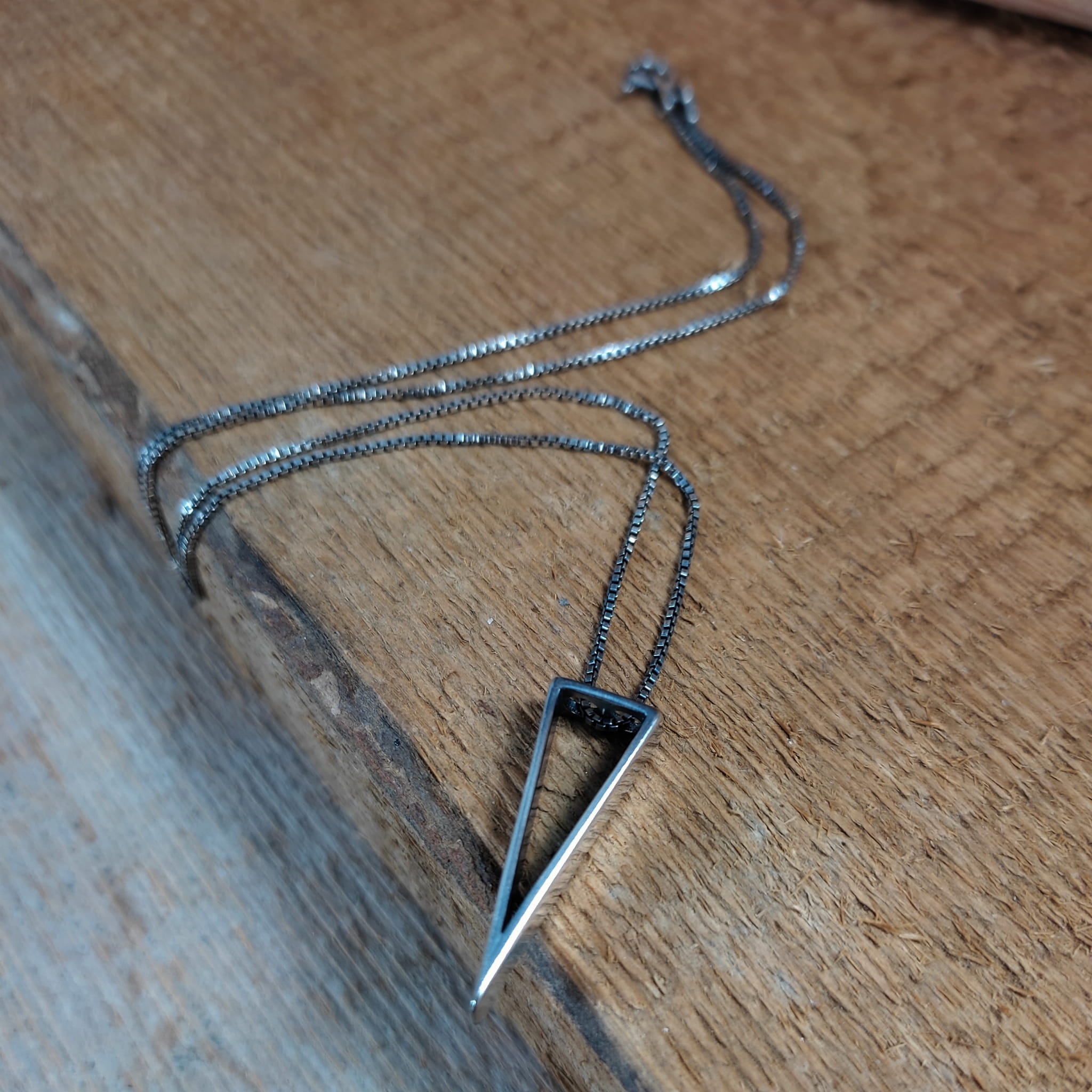 Naszyjnik z trójkątem. Długość naszyjnika wynosi ok. 40 cm, plus dodatkowo łańcuszek regulacyjny 5 cm. Wymiary blaszki to 24,3/8,7/4,3 mm. Naszyjnik został wykonany w całości ze srebra 925, srebro oksydowane. Zapakowany w eleganckie pudełko.