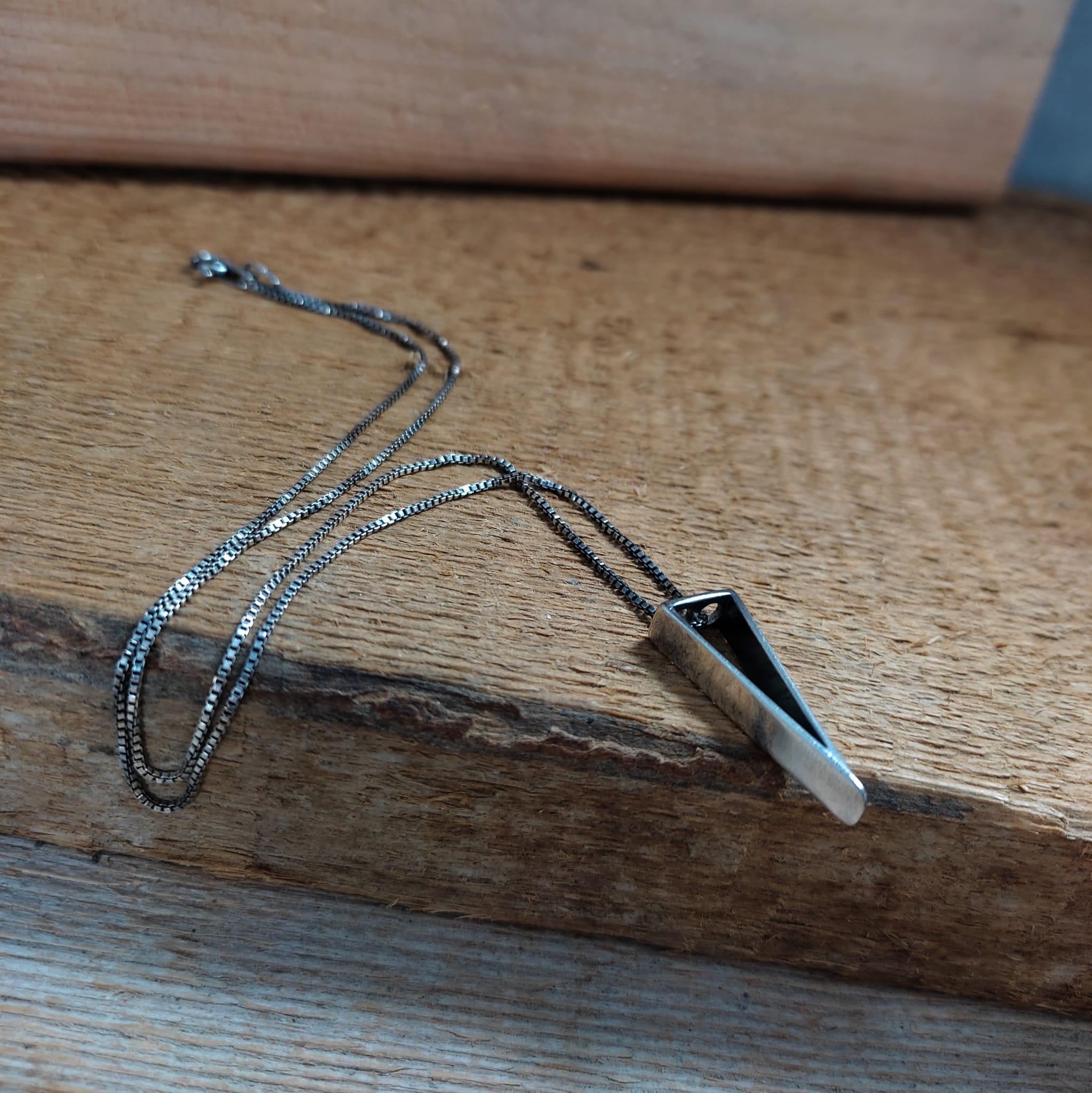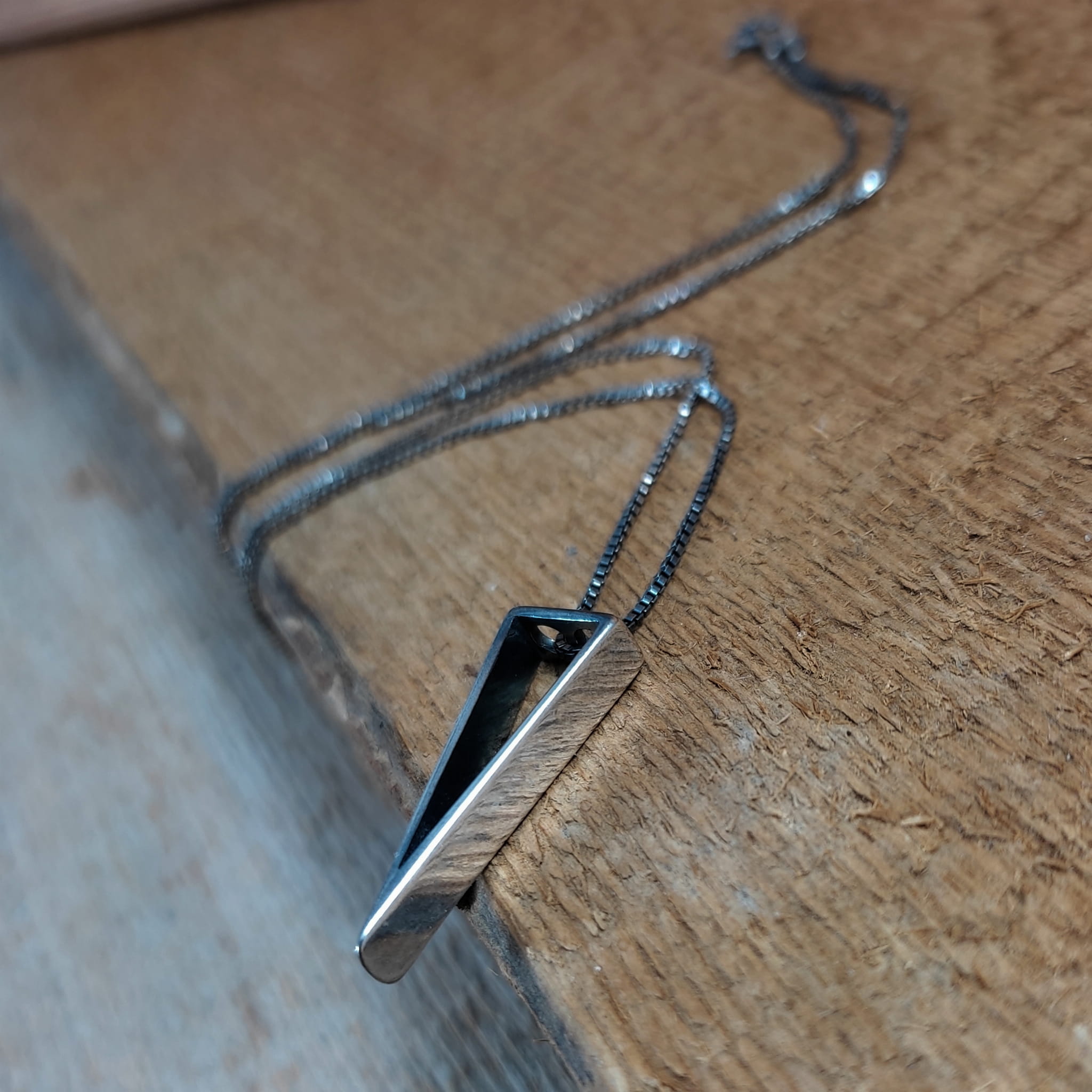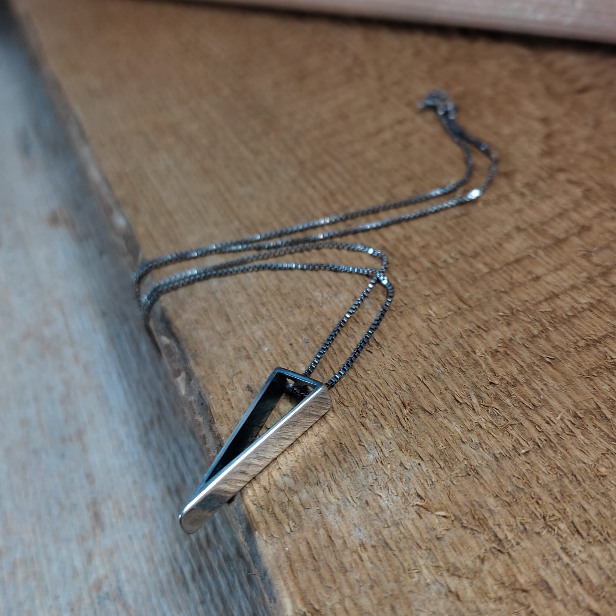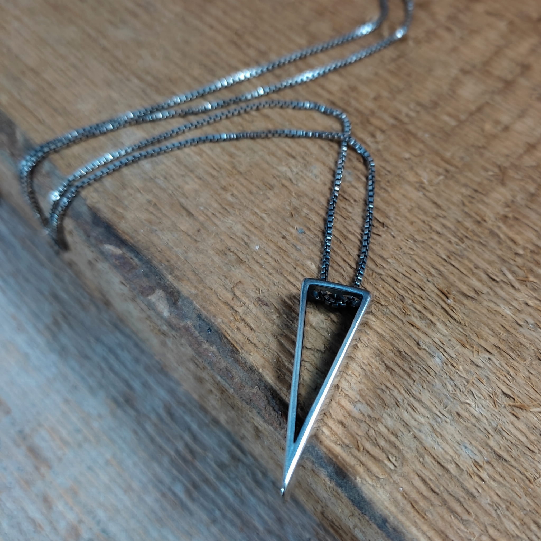 Naszyjnik z trójkątem. Długość naszyjnika wynosi ok. 40 cm, plus dodatkowo łańcuszek regulacyjny 5 cm. Wymiary blaszki to 24,3/8,7/4,3 mm. Naszyjnik został wykonany w całości ze srebra 925, srebro oksydowane. Zapakowany w eleganckie pudełko.